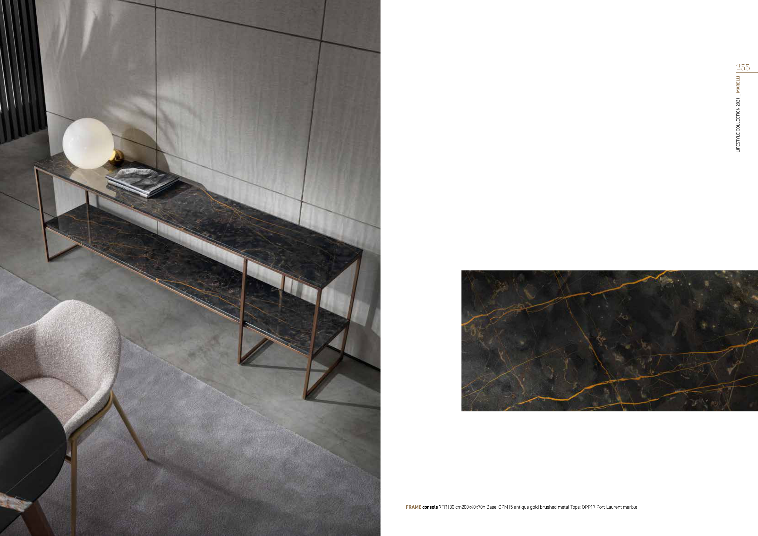 FRAME console 7FR130 cm200x40x70h Base: OPM15 antique gold brushed metal Tops: OPP17 Port Laurent marble