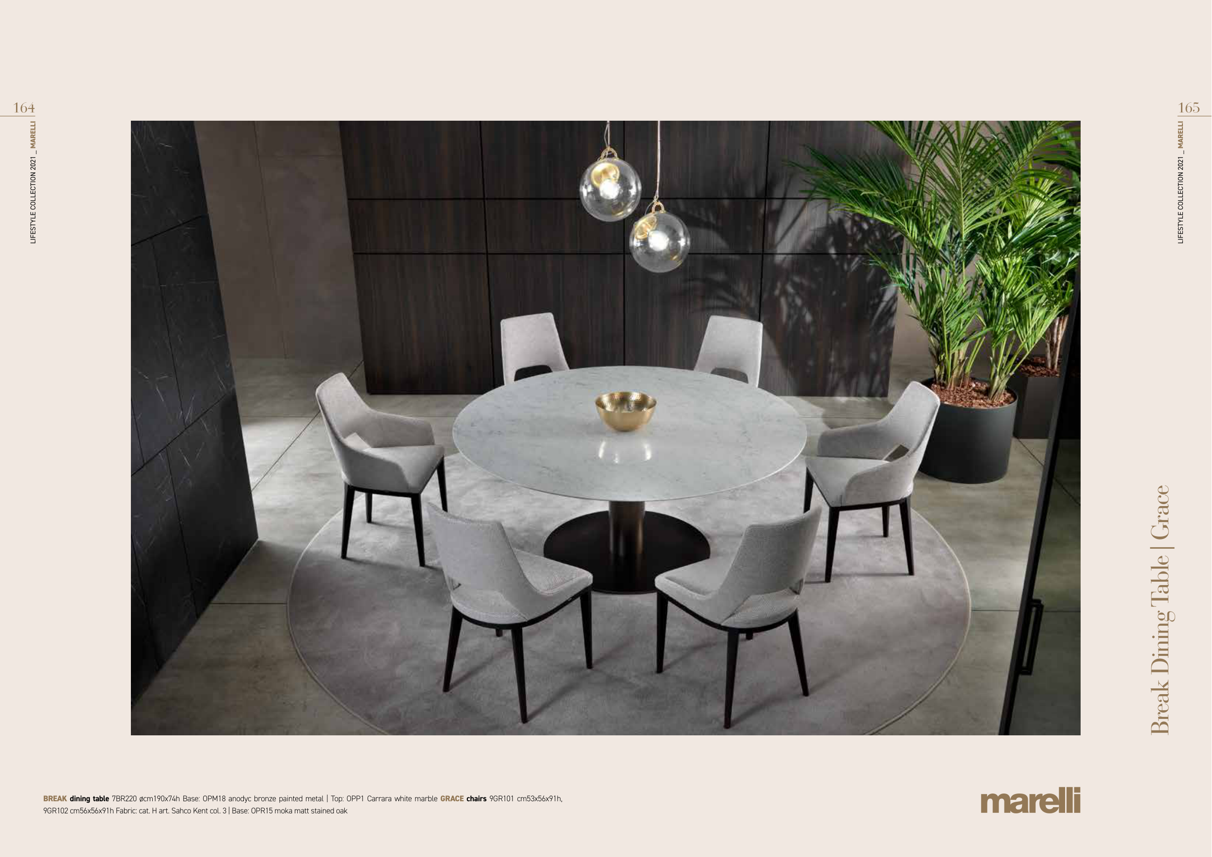 BREAK dining table 7BR220 øcm190x74h Base: OPM18 anodyc bronze painted metal | Top: OPP1 Carrara white marble GRACE chairs 9GR101 cm53x56x91h,
