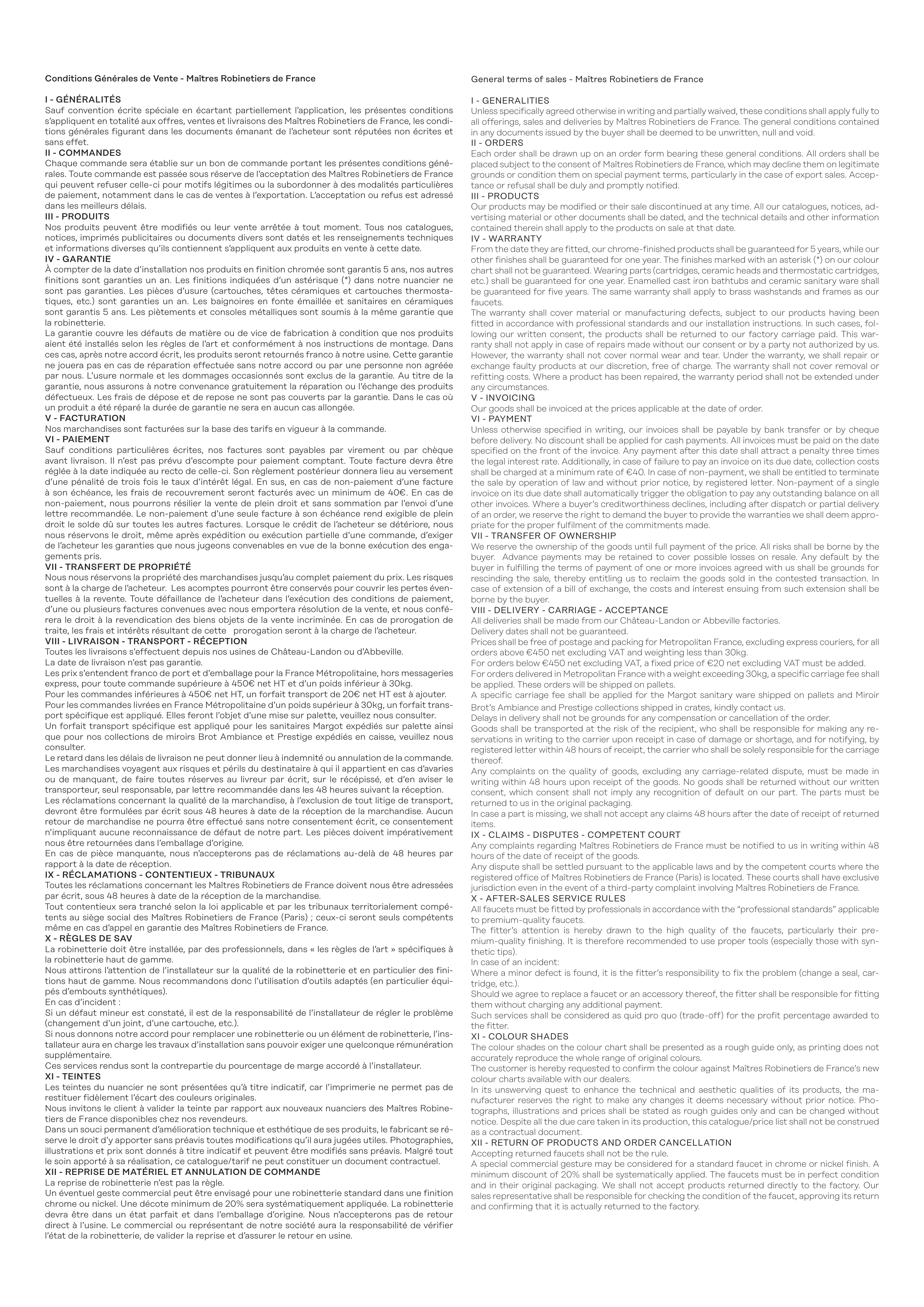 General terms of sales - Maîtres Robinetiers de France