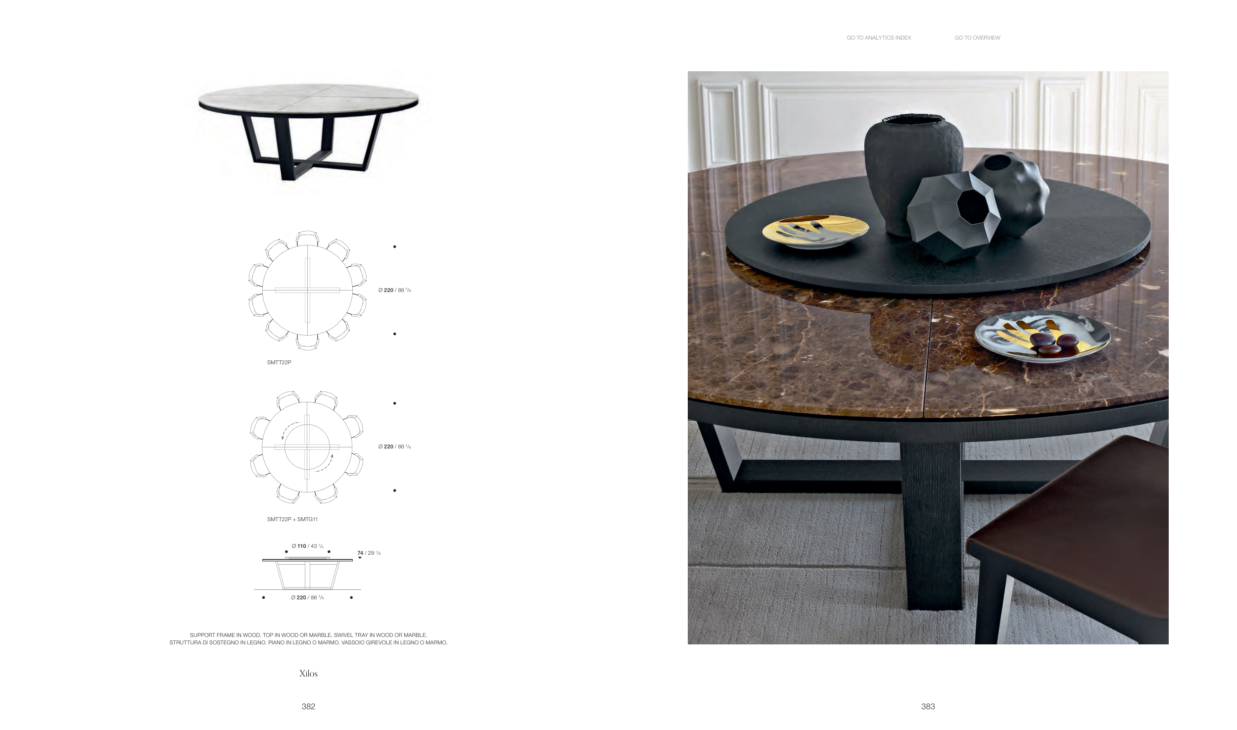 SUPPORT FRAME IN WOOD. TOP IN WOOD OR MARBLE. SWIVEL TRAY IN WOOD OR MARBLE.