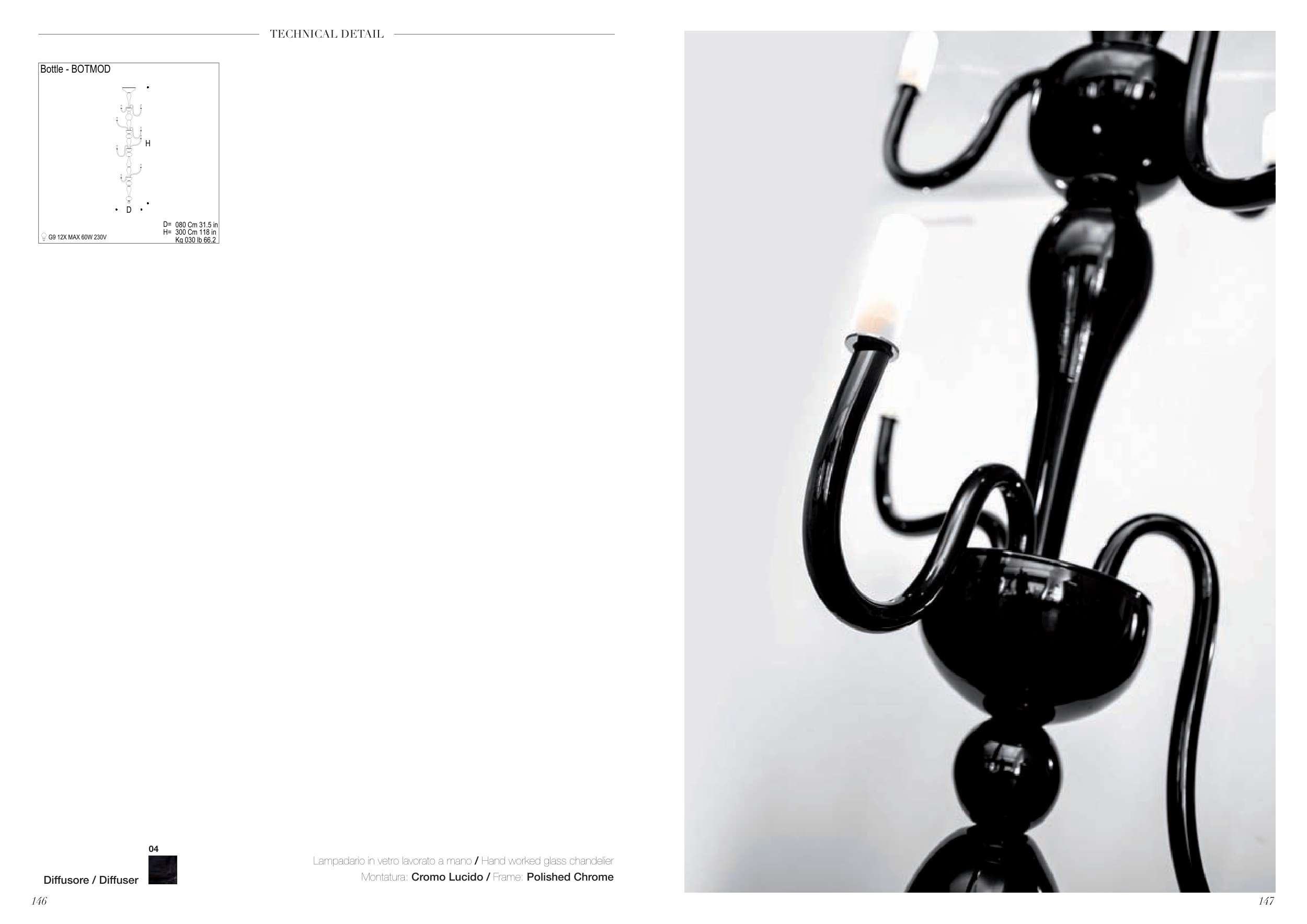 147 146 TECHNICAL DETAIL Bottle - BOTMOD G9 12X MAX 60W 230V Kg 030 lb 66.2 H= 300 Cm 118 in D= 080 Cm 31.5 in D H 04 Lampadario in vetro lavorato a mano / Hand worked glass chandelier Montatura: Cromo Lucido / Frame: Polished Chrome Diffusore / Diffuser