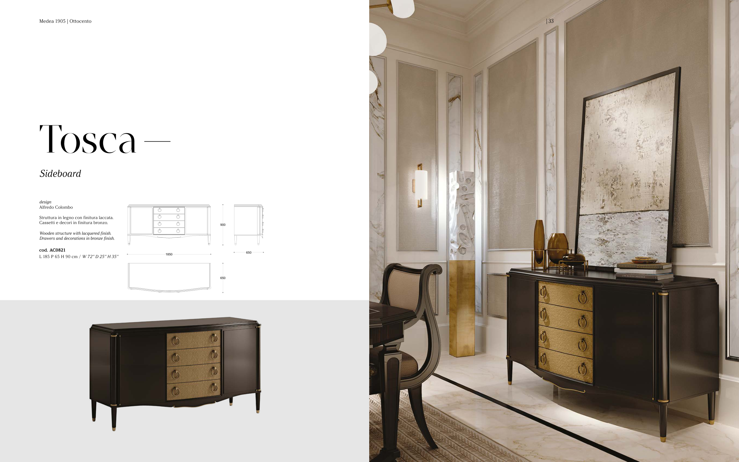 Cassetti e decori in finitura bronzo.