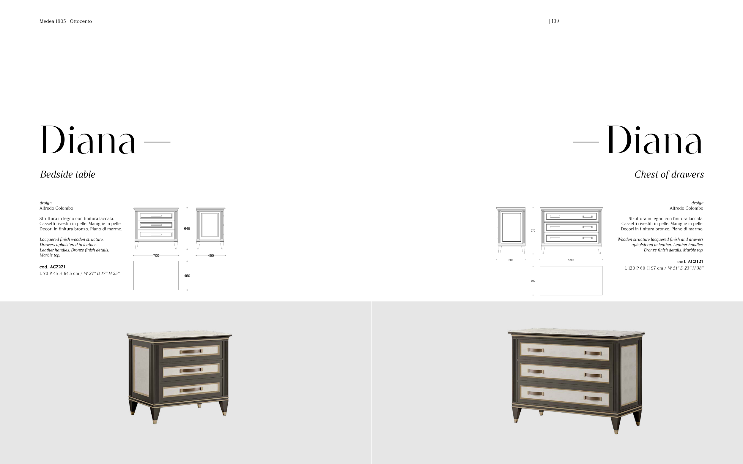 Cassetti rivestiti in pelle. Maniglie in pelle.