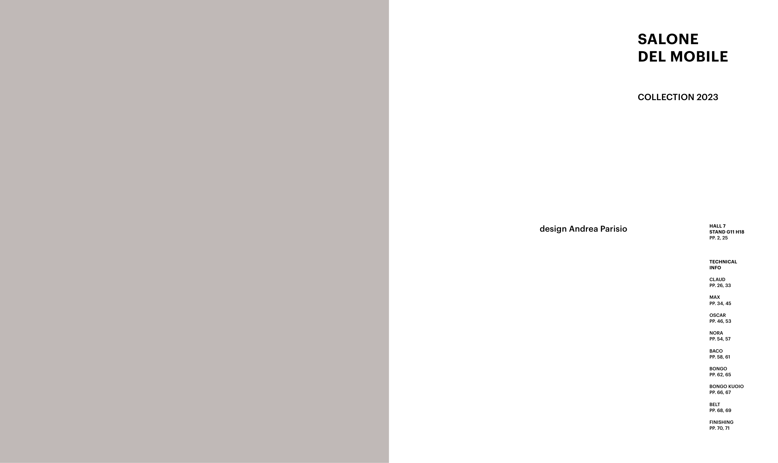 design Andrea Parisio SALONE DEL MOBILE COLLECTION 2023 HALL 7 STAND G11 H18 PP. 2, 25 TECHNICAL INFO CLAUD PP. 26, 33 MAX PP. 34, 45 OSCAR PP. 46, 53 NORA PP. 54, 57 BACO PP. 58, 61 BONGO PP. 62, 65 BONGO KUOIO PP. 66, 67 BELT PP. 68, 69 FINISHING PP. 70, 71