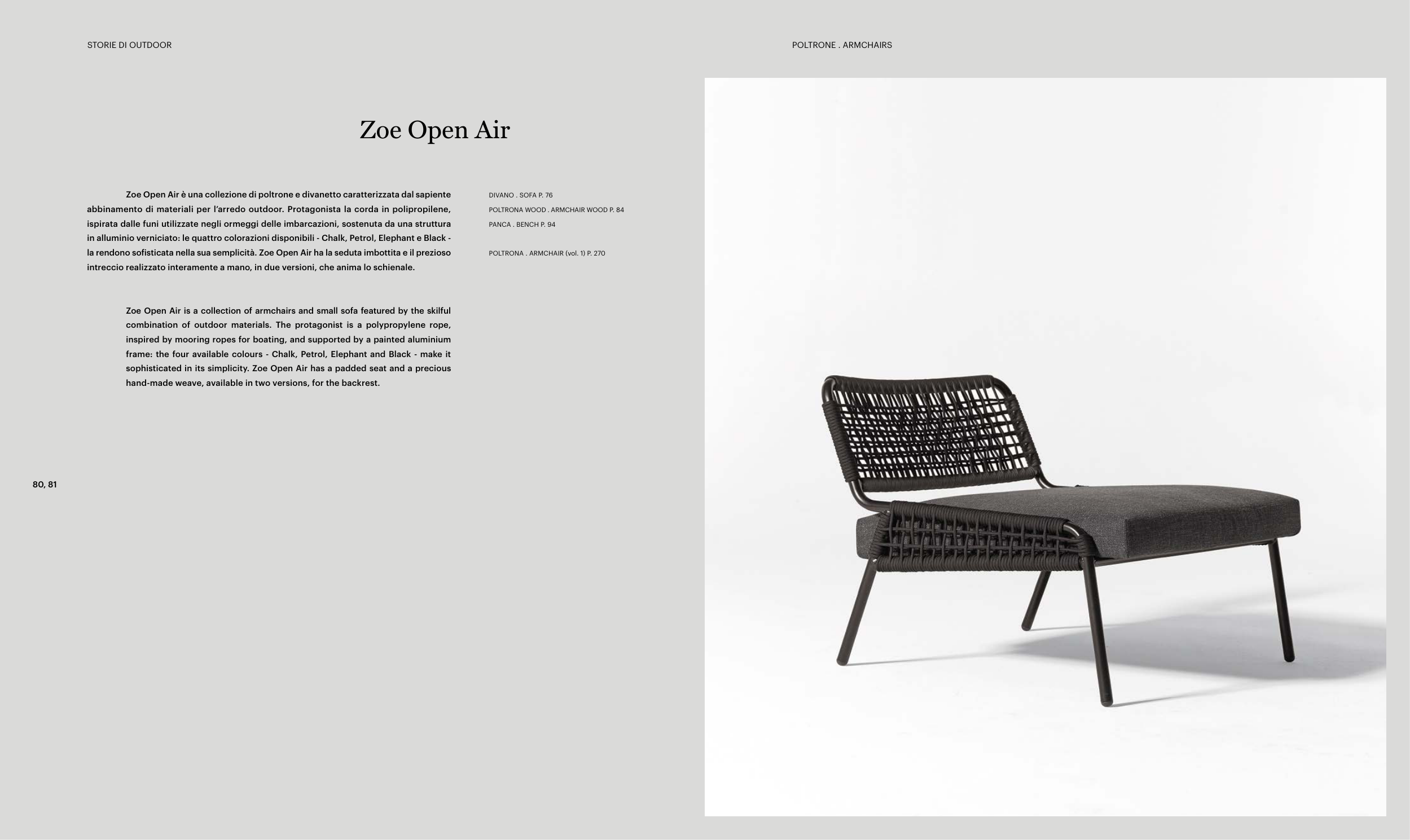 Zoe Open Air è una collezione di poltrone e divanetto caratterizzata dal sapiente