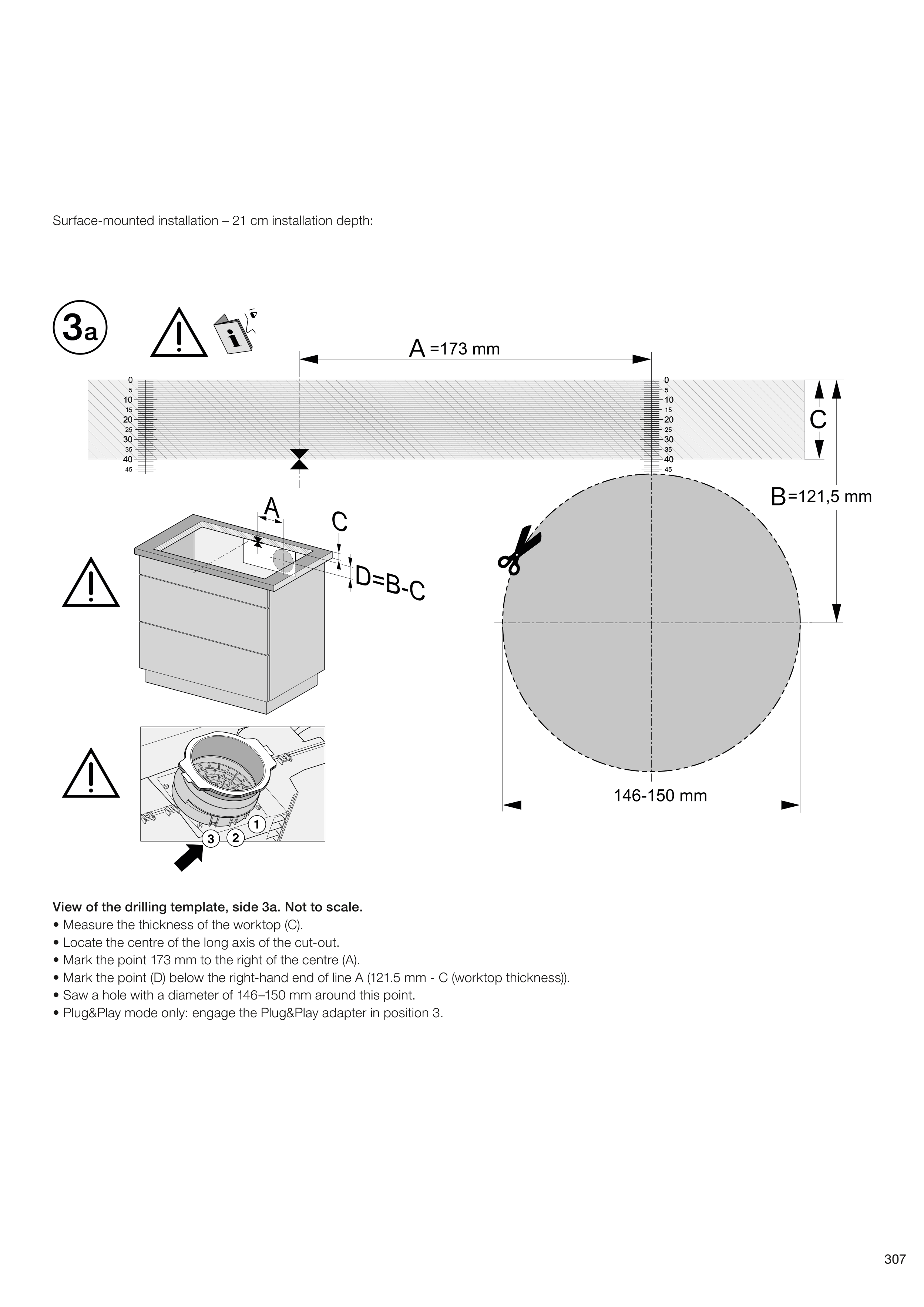 • Saw a hole with a diameter of 146–150 mm around this point.