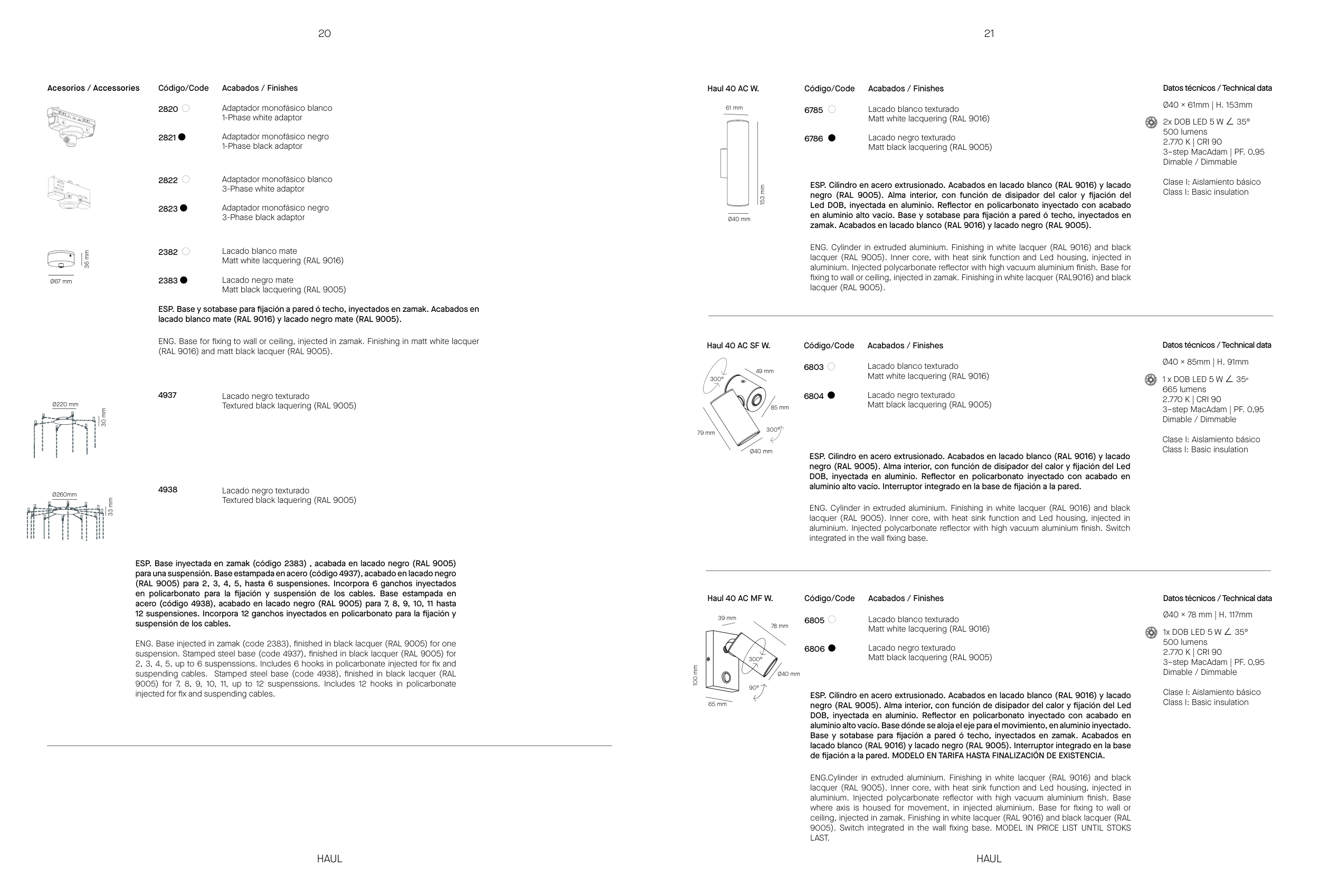 lacado blanco (RAL 9016) y lacado negro (RAL 9005). Interruptor integrado en la base