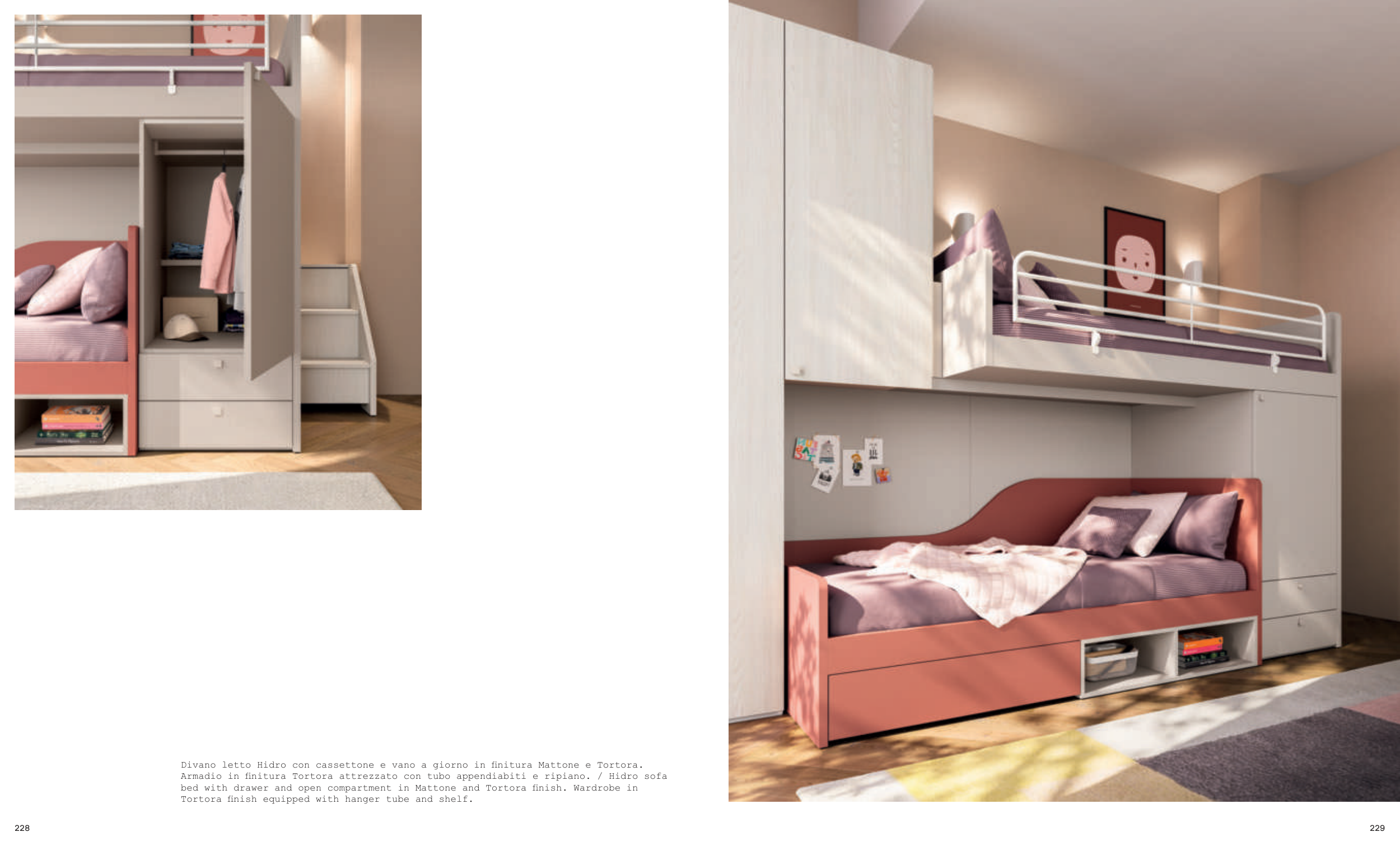 bed with drawer and open compartment in Mattone and Tortora finish. Wardrobe in