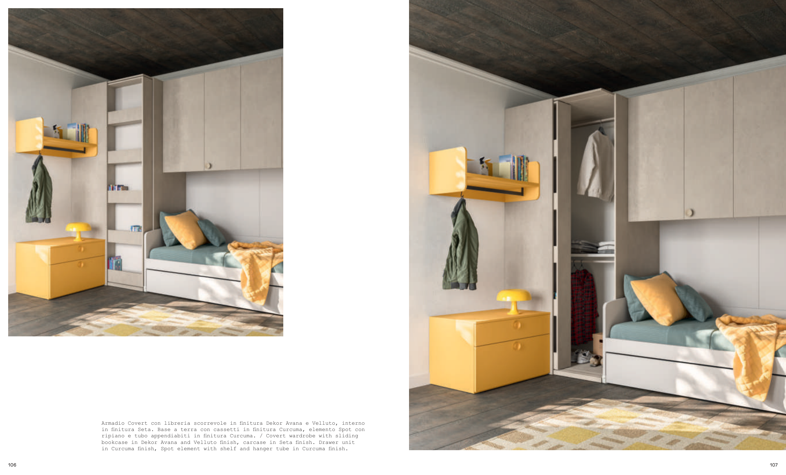 ripiano e tubo appendiabiti in finitura Curcuma. / Covert wardrobe with sliding