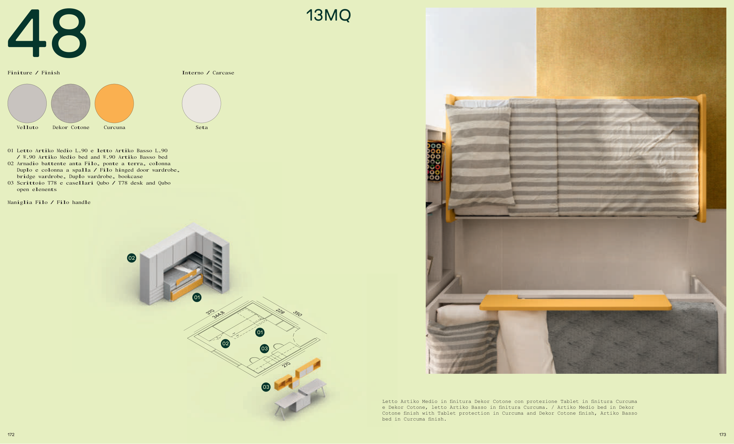 e Dekor Cotone, letto Artiko Basso in finitura Curcuma. / Artiko Medio bed in Dekor