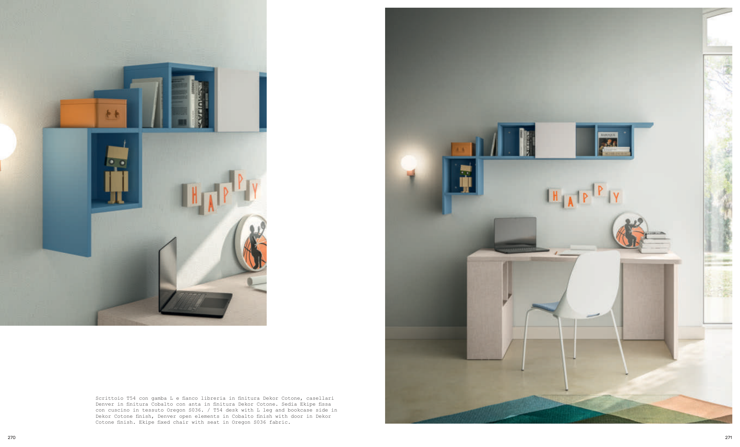 con cuscino in tessuto Oregon S036. / T54 desk with L leg and bookcase side in