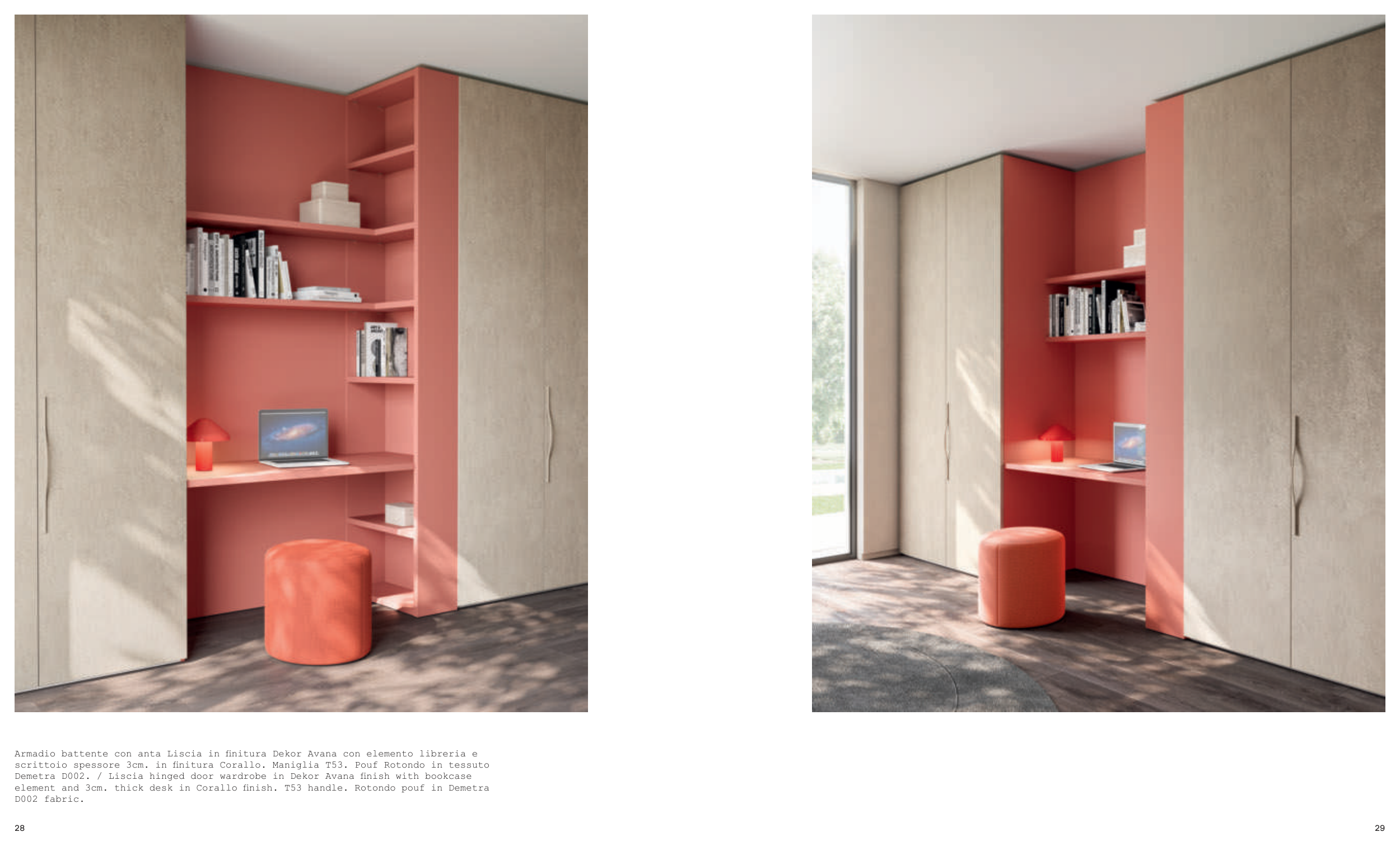 element and 3cm. thick desk in Corallo finish. T53 handle. Rotondo pouf in Demetra