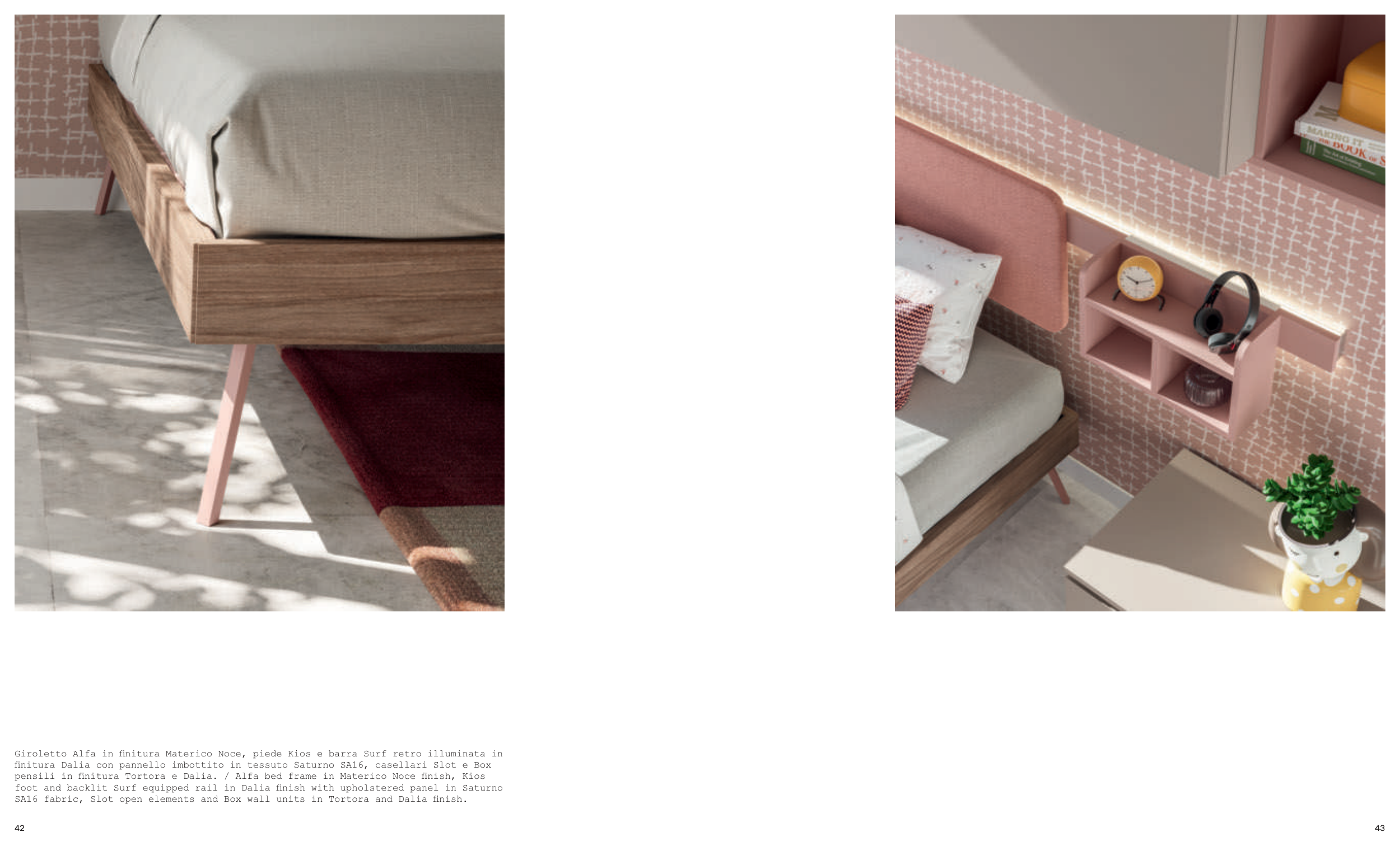 pensili in finitura Tortora e Dalia. / Alfa bed frame in Materico Noce finish, Kios