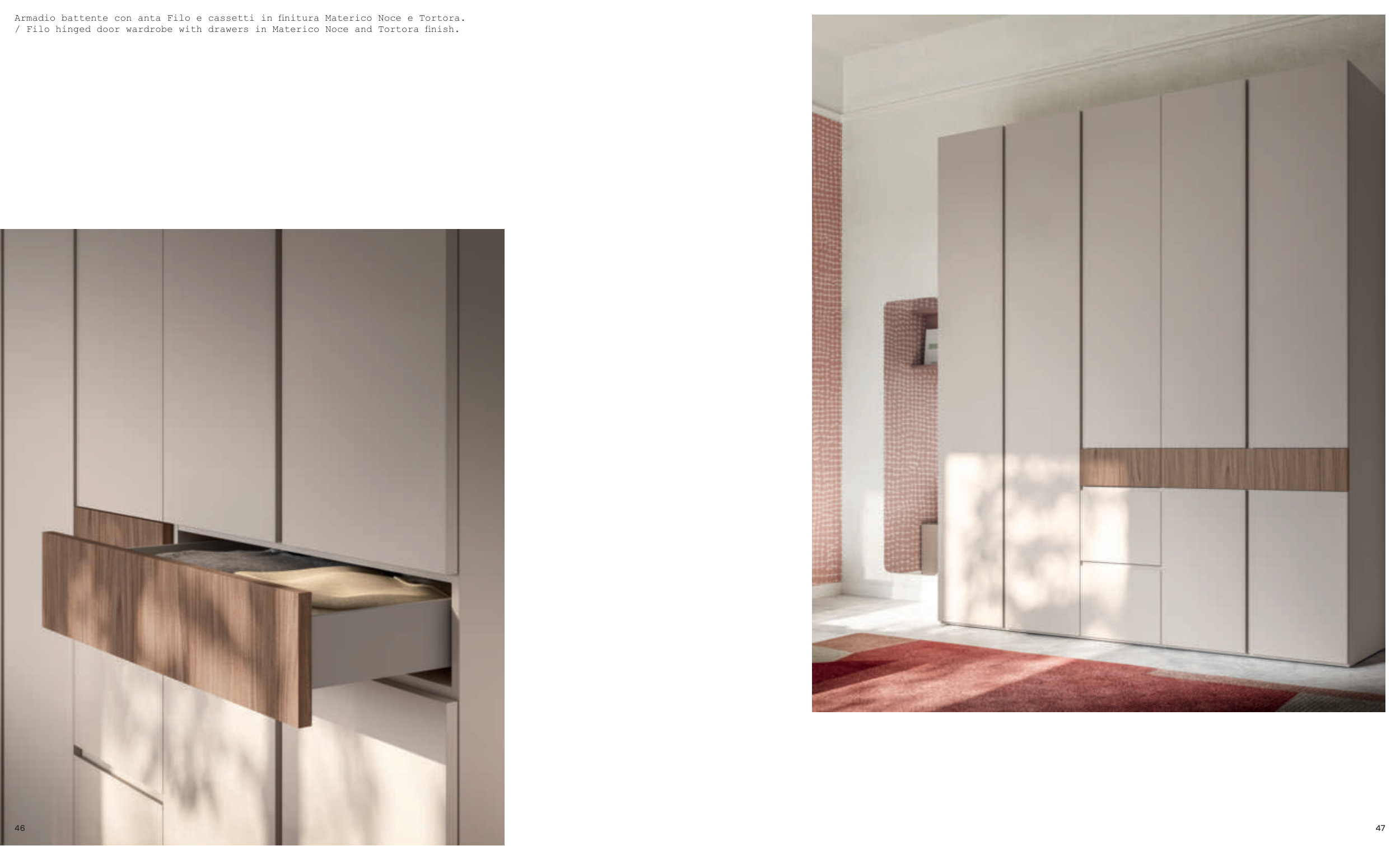 / Filo hinged door wardrobe with drawers in Materico Noce and Tortora finish.