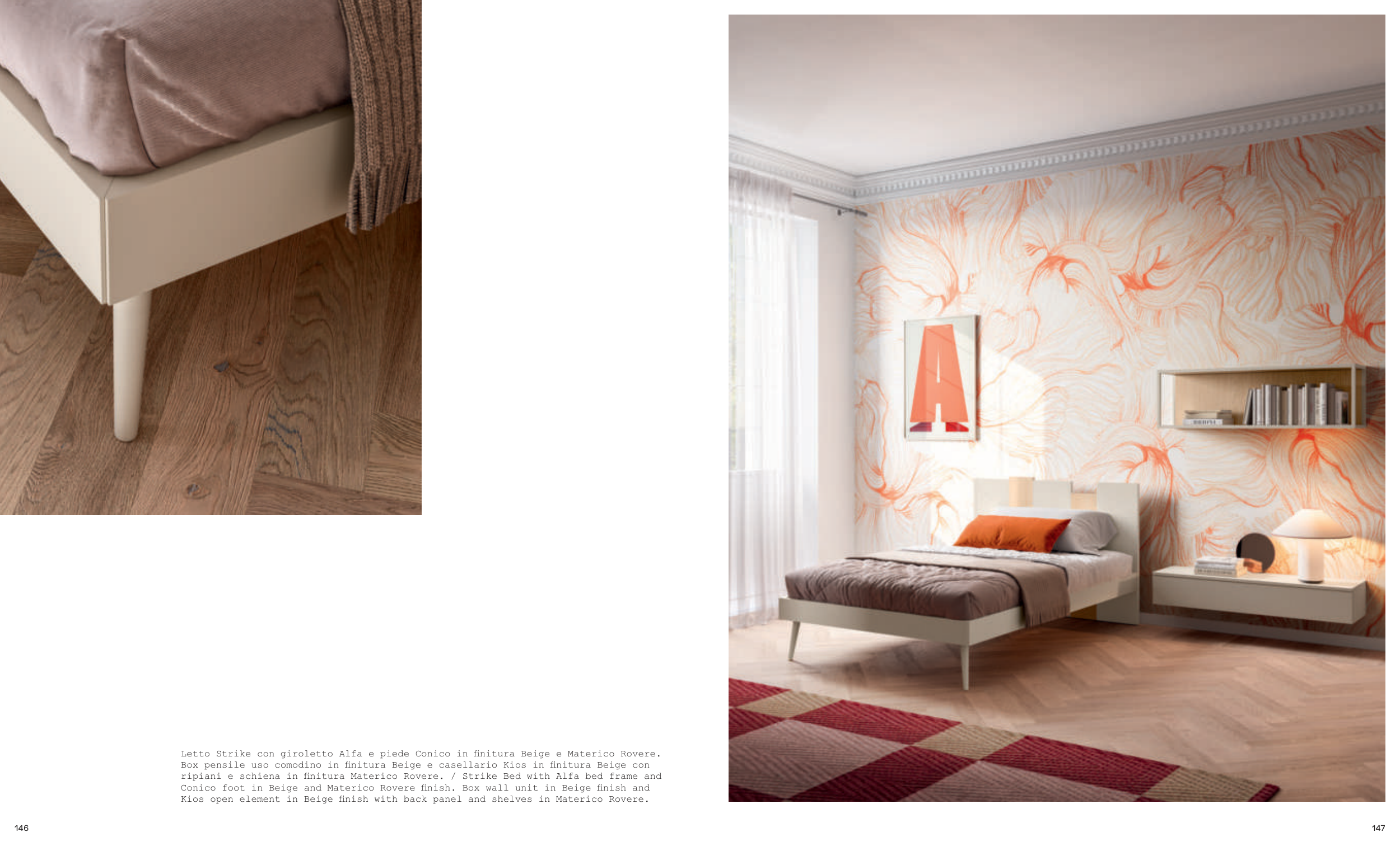 ripiani e schiena in finitura Materico Rovere. / Strike Bed with Alfa bed frame and