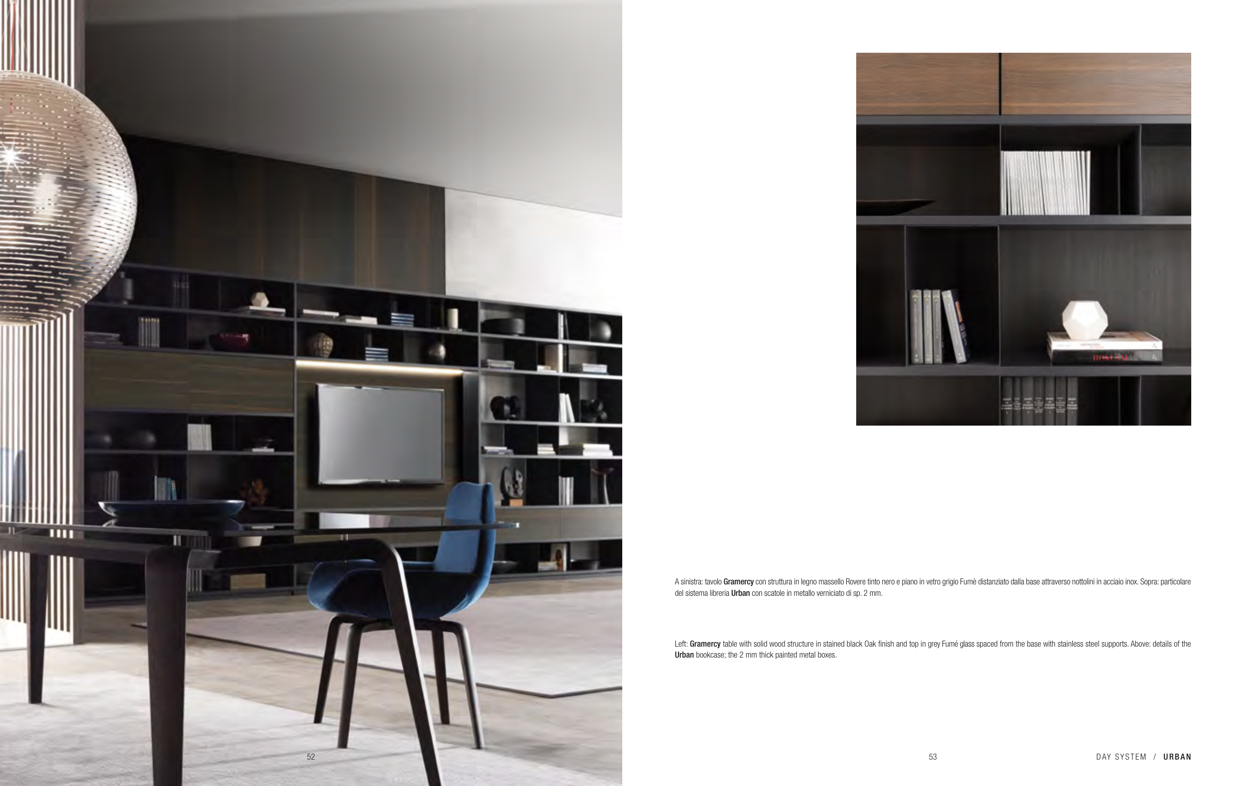 A sinistra: tavolo Gramercy con struttura in legno massello Rovere tinto nero e piano in vetro grigio Fumè distanziato dalla base attraverso nottolini in acciaio inox. Sopra: particolare