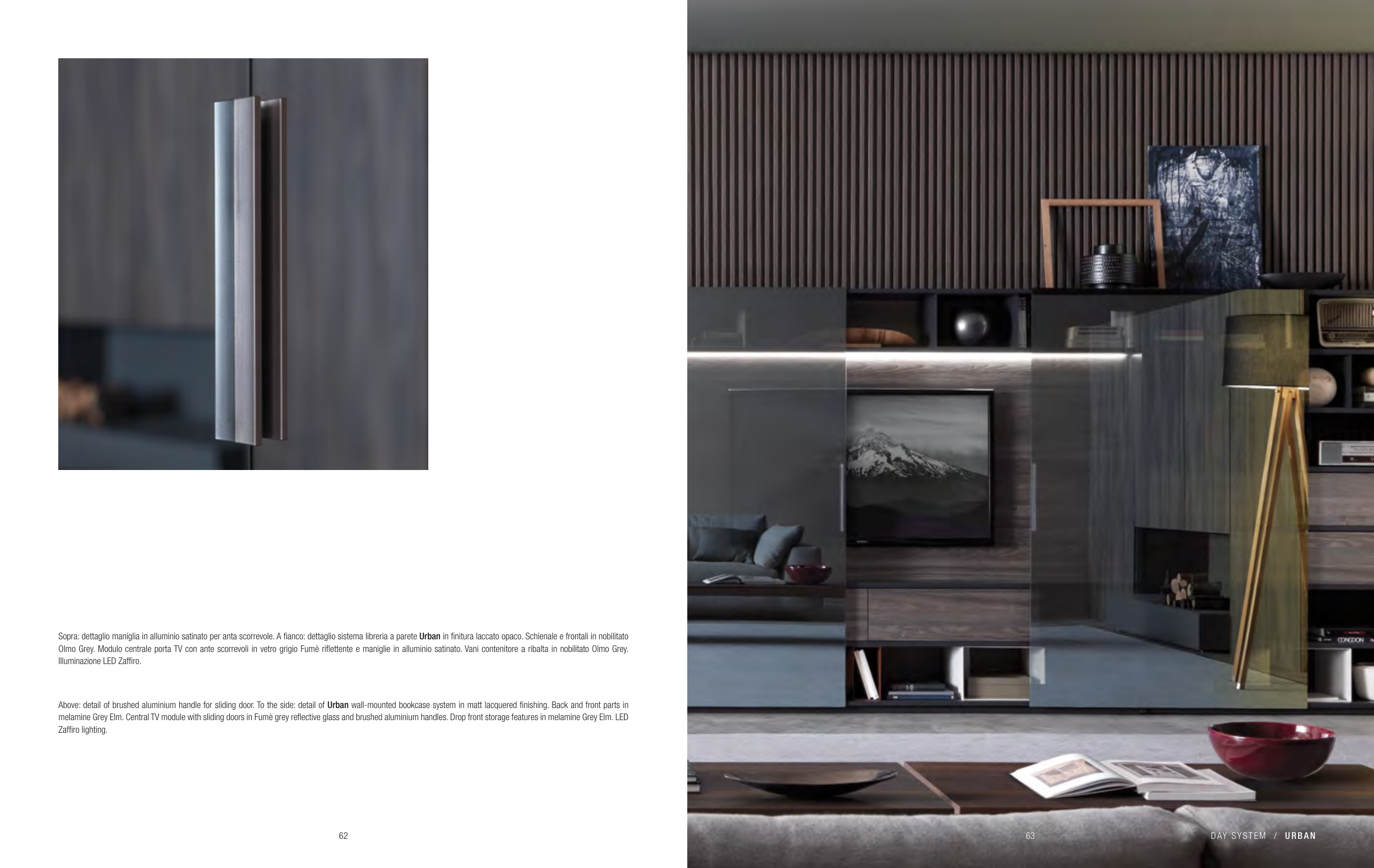 Sopra: dettaglio maniglia in alluminio satinato per anta scorrevole. A fianco: dettaglio sistema libreria a parete Urban in finitura laccato opaco. Schienale e frontali in nobilitato