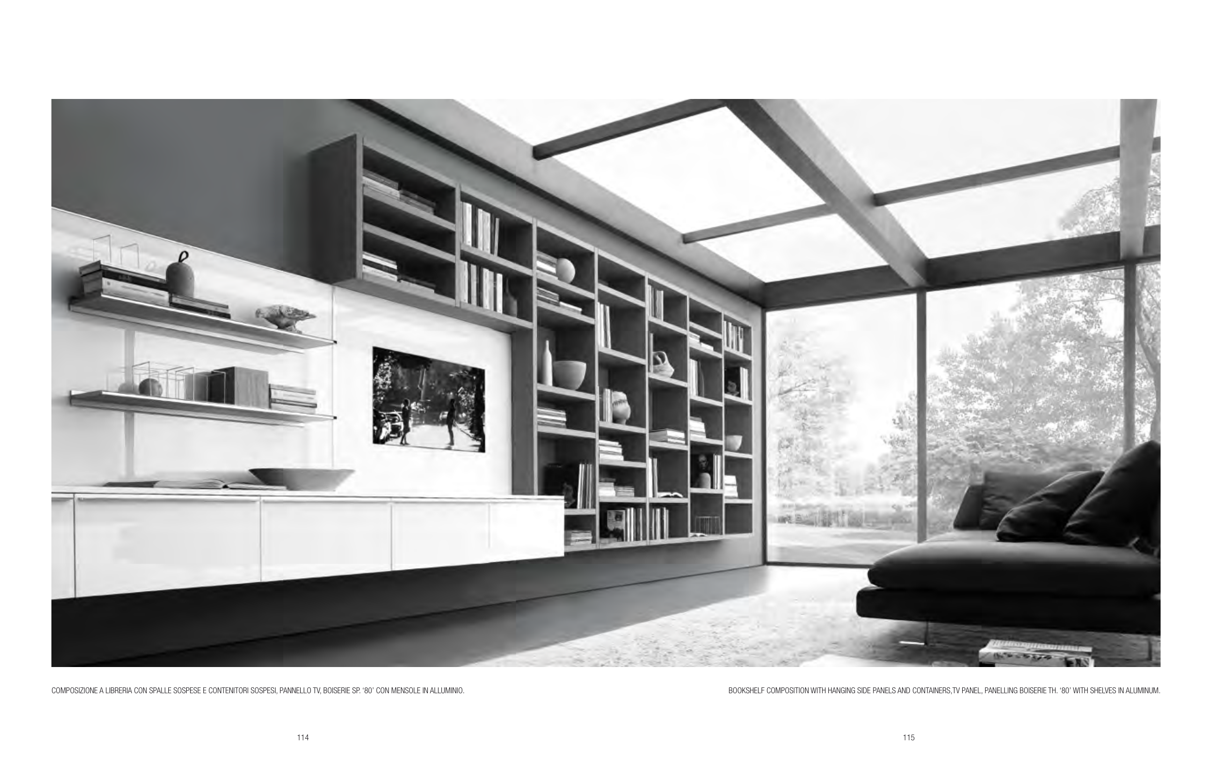 COMPOSIZIONE A LIBRERIA CON SPALLE SOSPESE E CONTENITORI SOSPESI, PANNELLO TV, BOISERIE SP. ‘80’ CON MENSOLE IN ALLUMINIO.