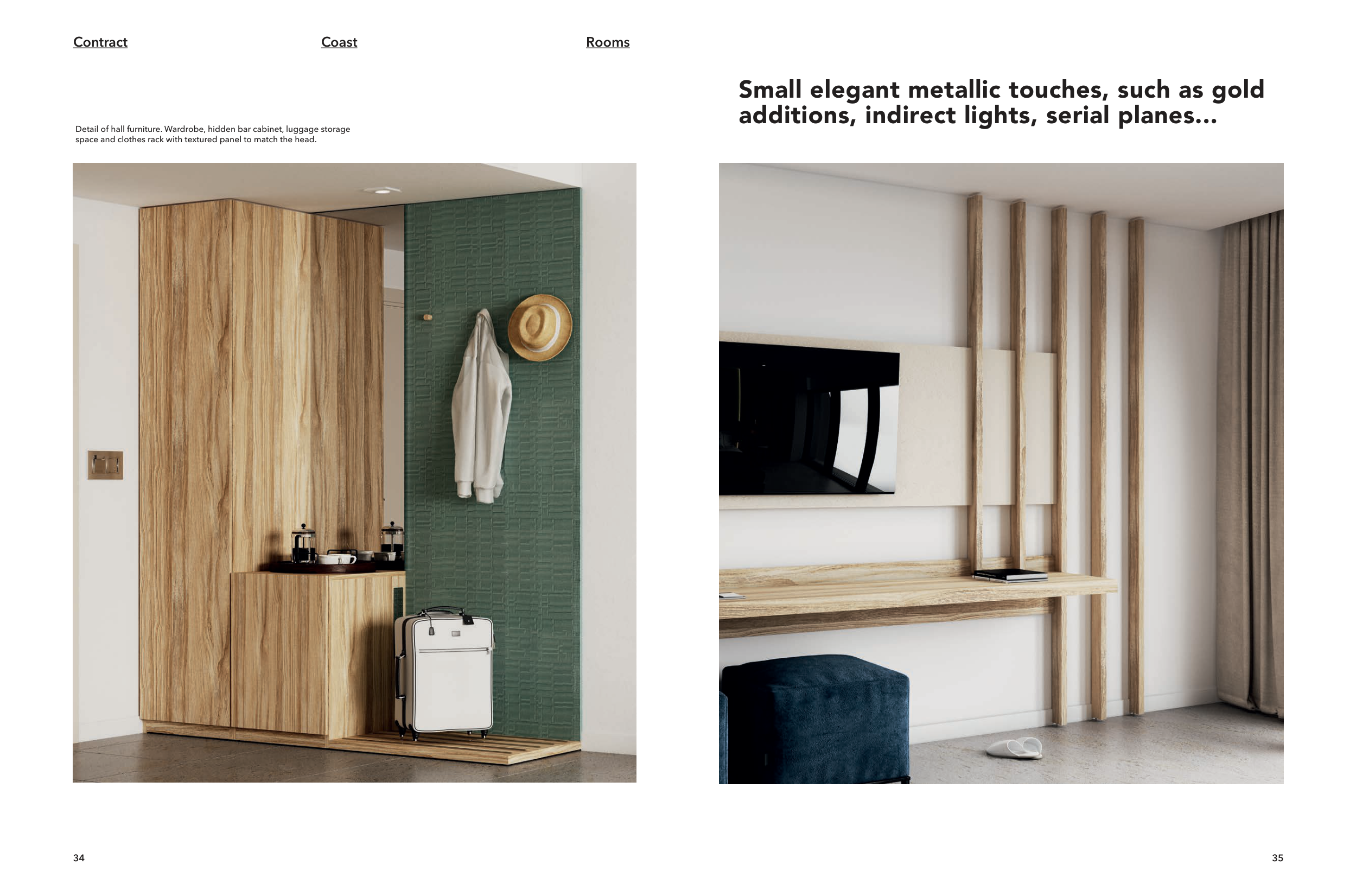34 35 Contract Coast Rooms Small elegant metallic touches, such as gold additions, indirect lights, serial planes... Detail of hall furniture. Wardrobe, hidden bar cabinet, luggage storage space and clothes rack with textured panel to match the head.