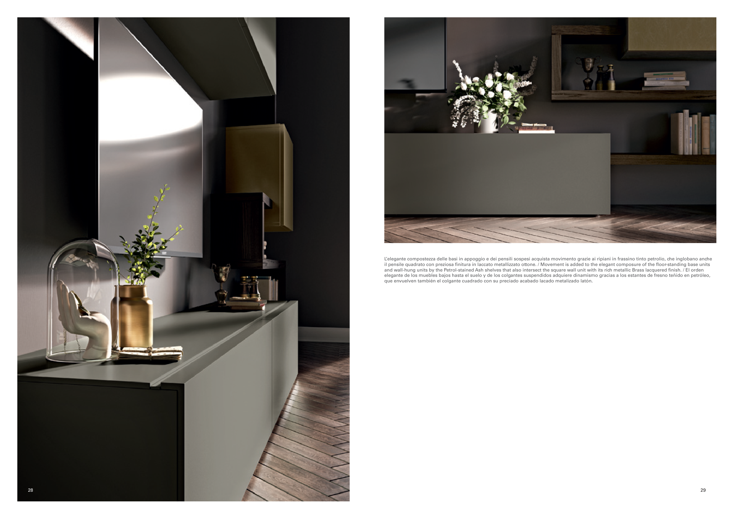 and wall-hung units by the Petrol-stained Ash shelves that also intersect the square wall unit with its rich metallic Brass lacquered finish. / El orden
