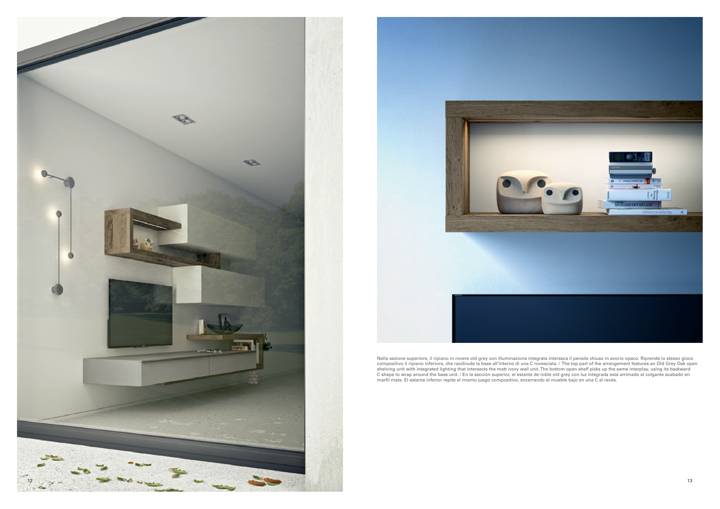 shelving unit with integrated lighting that intersects the matt ivory wall unit. The bottom open shelf picks up the same interplay, using its backward