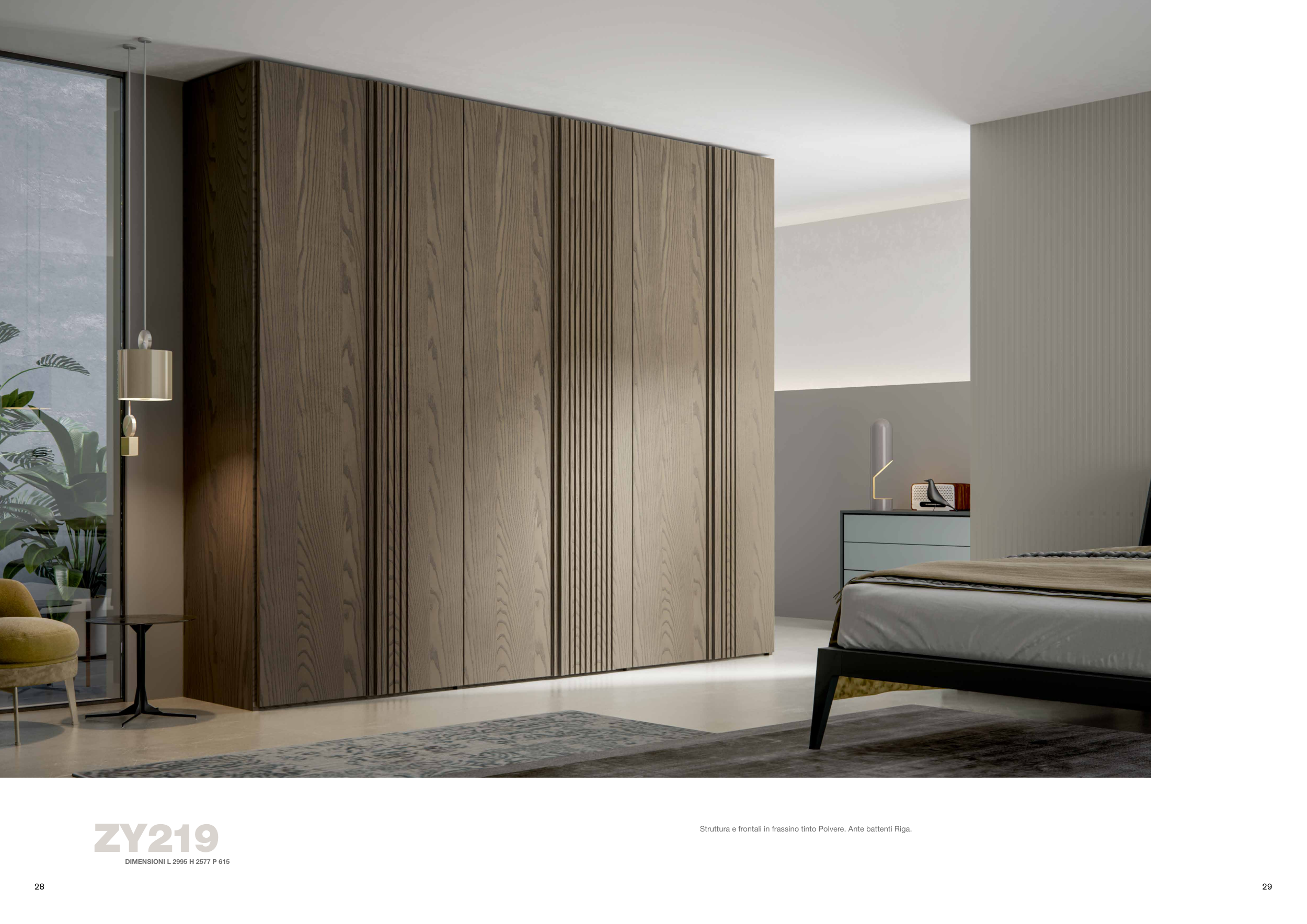 Struttura e frontali in frassino tinto Polvere. Ante battenti Riga.