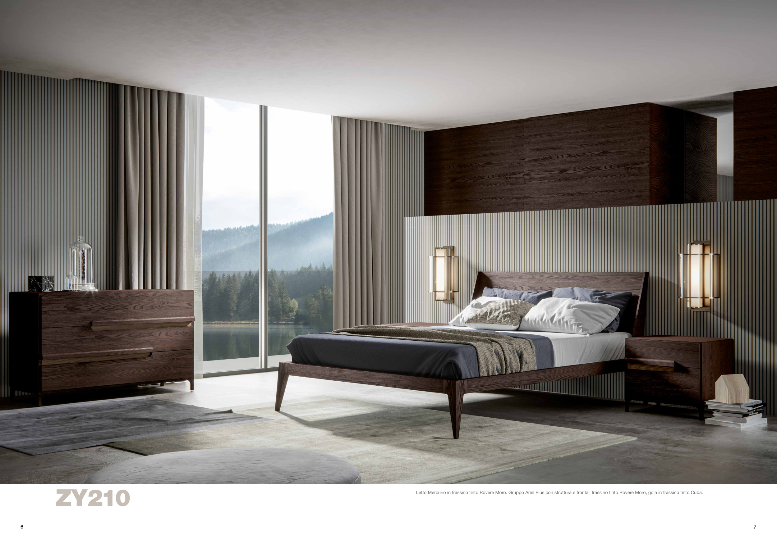 Letto Mercurio in frassino tinto Rovere Moro. Gruppo Ariel Plus con struttura e frontali frassino tinto Rovere Moro, gola in frassino tinto Cuba.