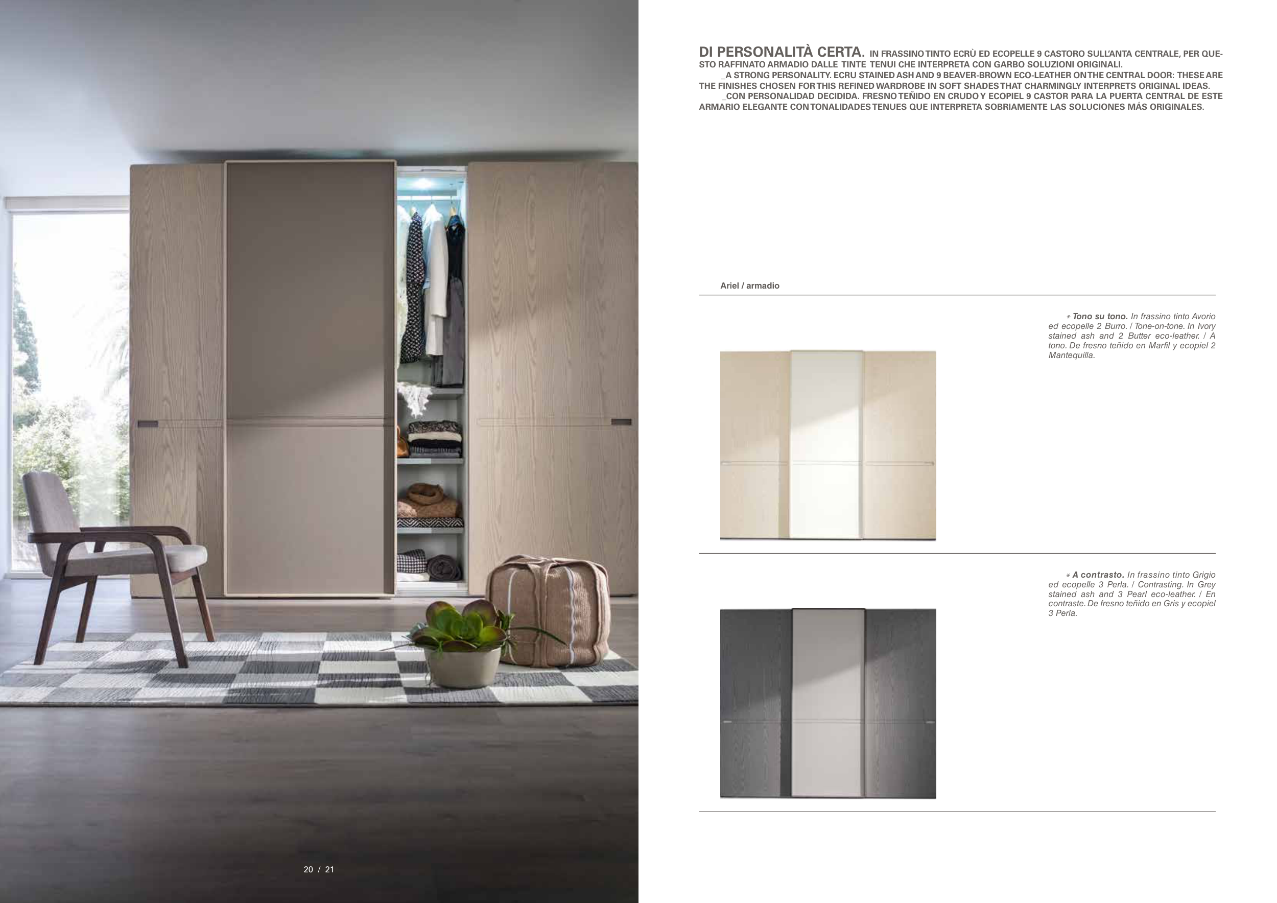 _A STRONG PERSONALITY. ECRU STAINED ASH AND 9 BEAVER-BROWN ECO-LEATHER ON THE CENTRAL DOOR: THESE ARE