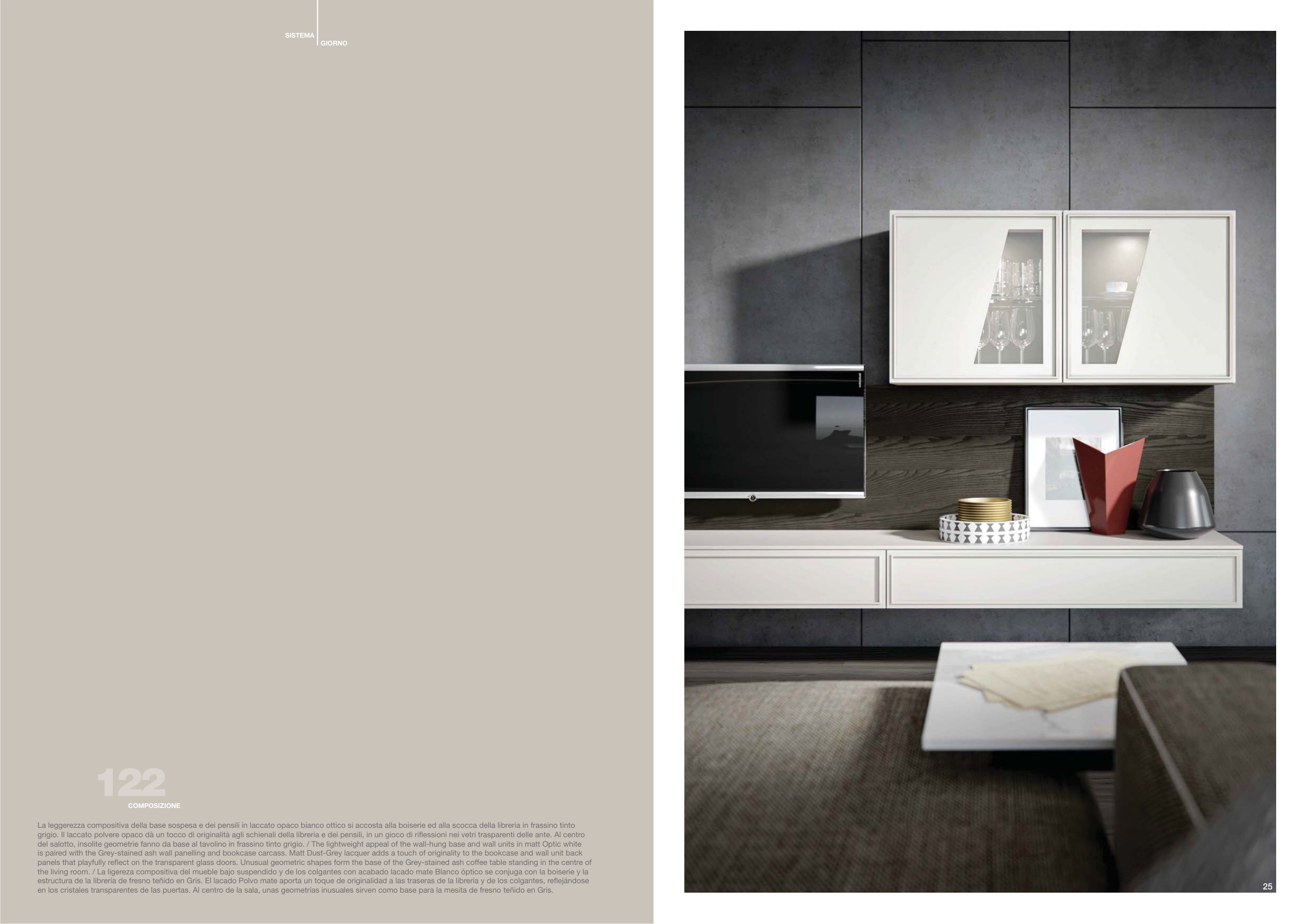 del salotto, insolite geometrie fanno da base al tavolino in frassino tinto grigio. / The lightweight appeal of the wall-hung base and wall units in matt Optic white
