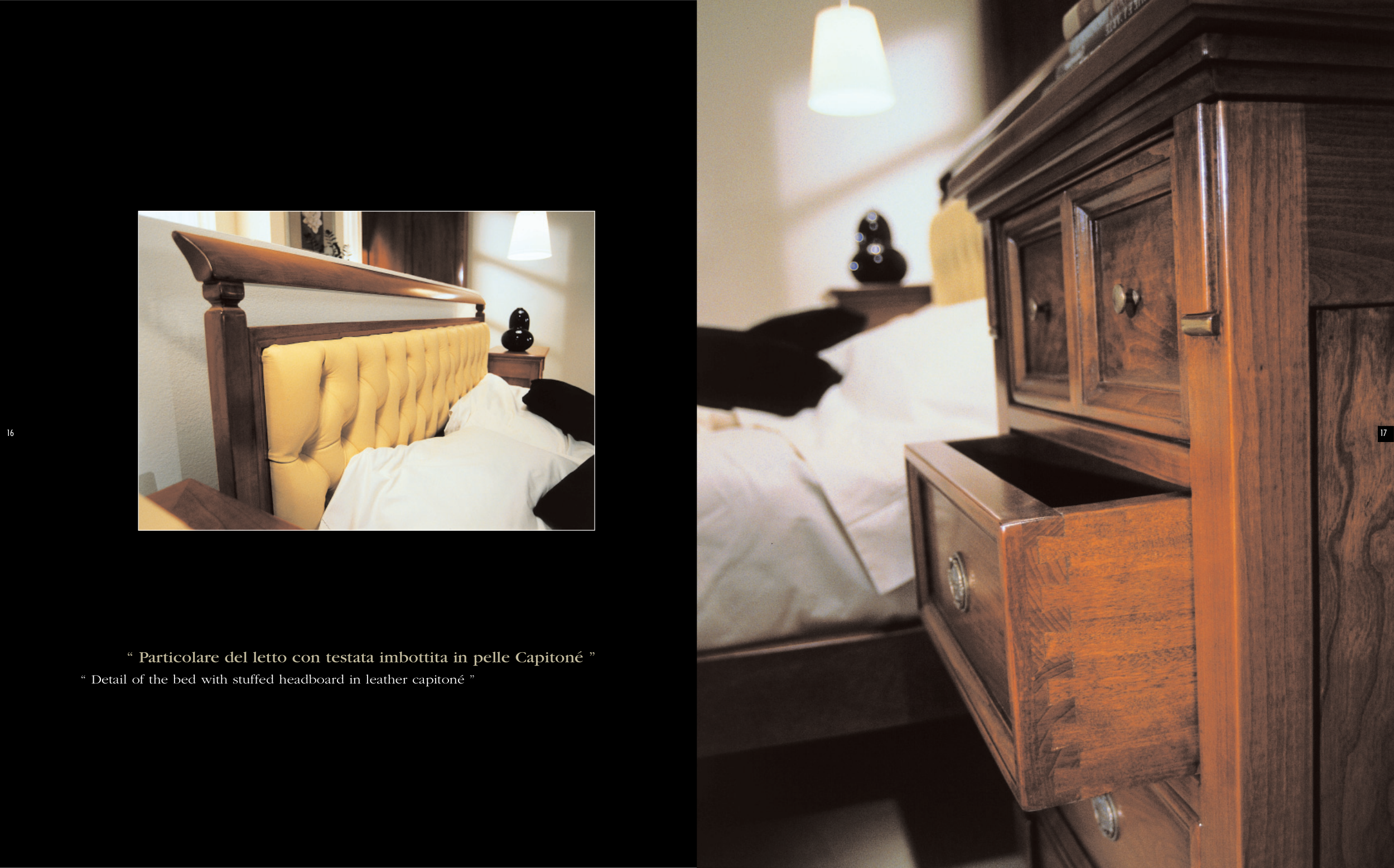 “ Particolare del letto con testata imbottita in pelle Capitoné ”