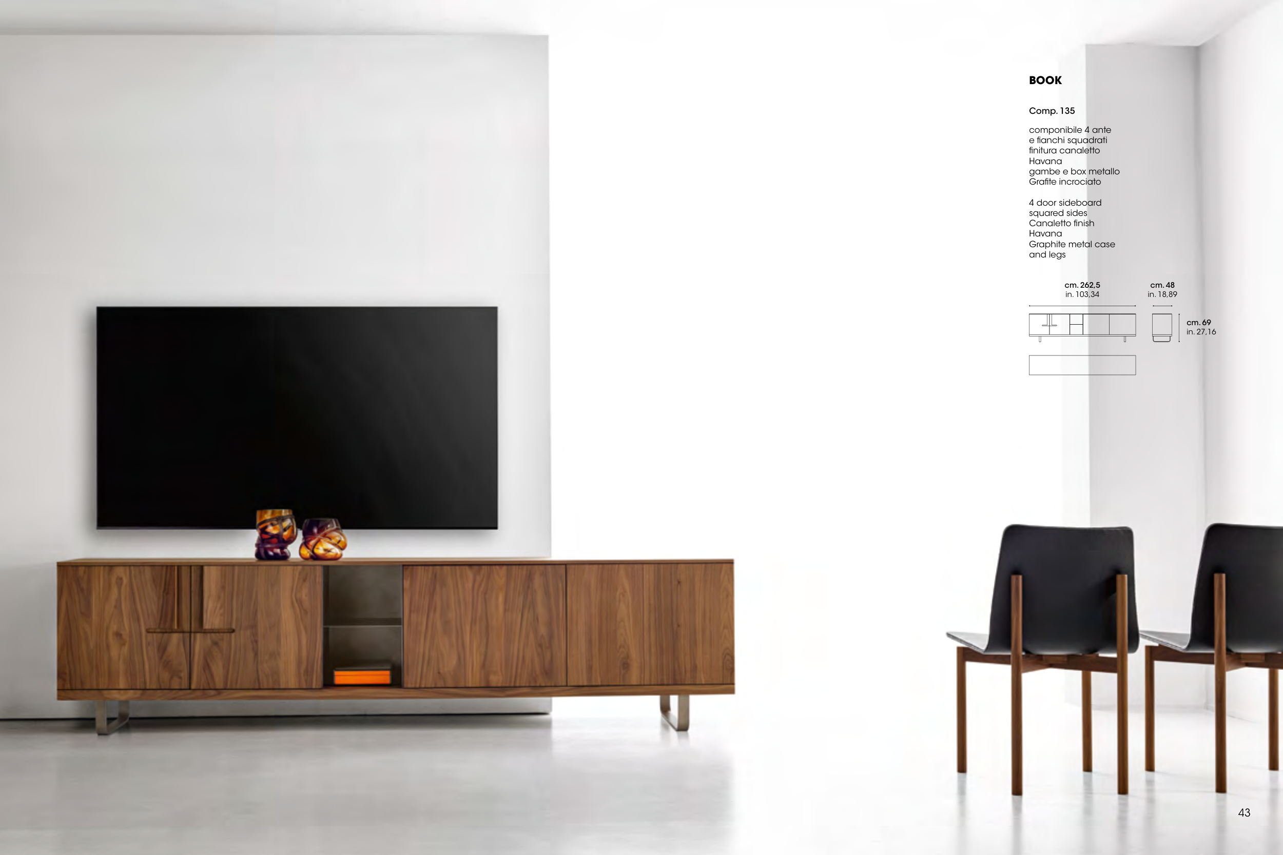 42 43 43 Comp. 135 componibile 4 ante e fianchi squadrati finitura canaletto Havana gambe e box metallo Grafite incrociato 4 door sideboard squared sides Canaletto finish Havana Graphite metal case and legs BOOK cm. 262,5 in. 103,34 cm. 69 in. 27,16 cm. 48 in. 18,89