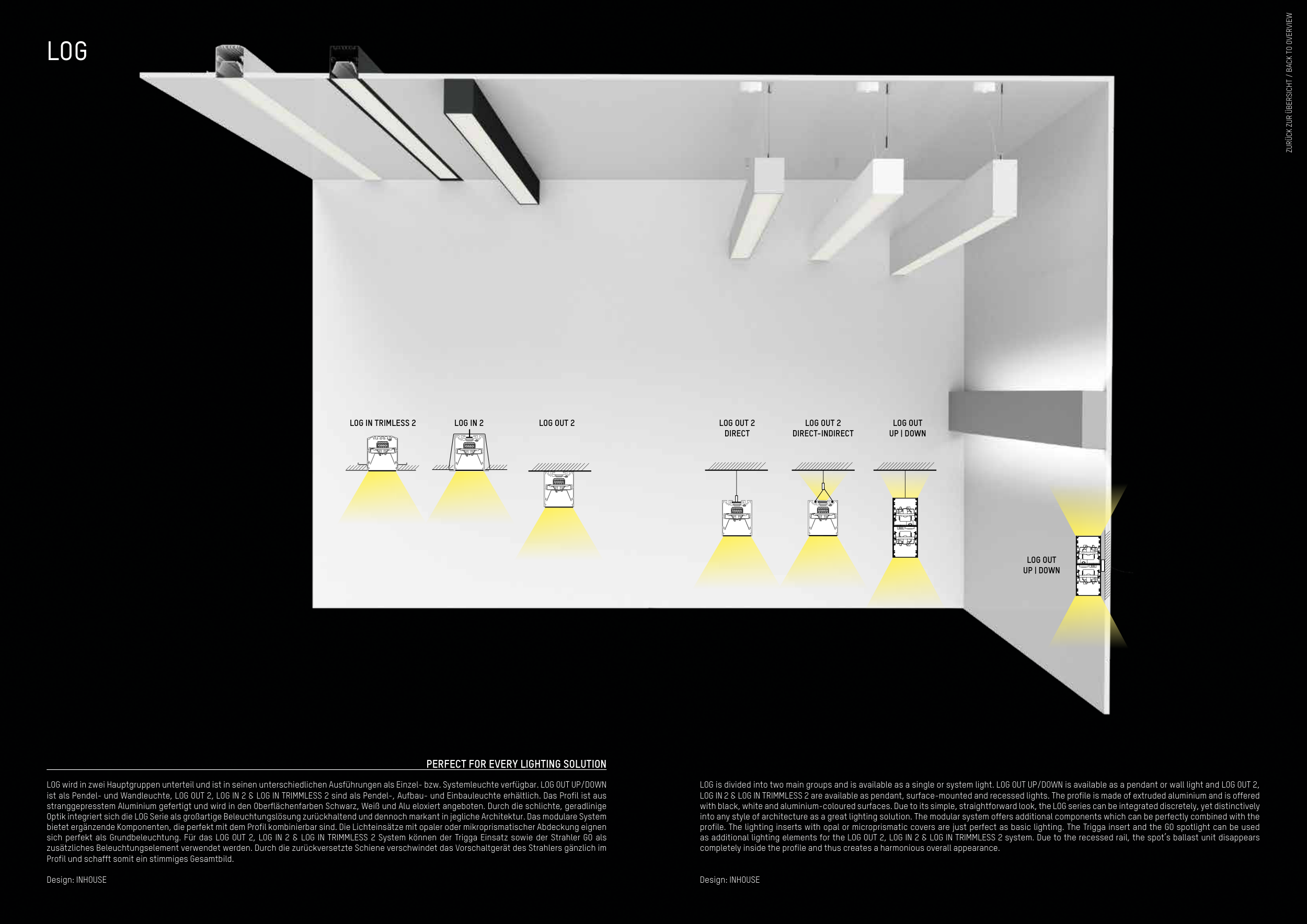 ist als Pendel- und Wandleuchte, LOG OUT 2, LOG IN 2 & LOG IN TRIMMLESS 2 sind als Pendel-, Aufbau- und Einbauleuchte erhältlich. Das Profil ist aus