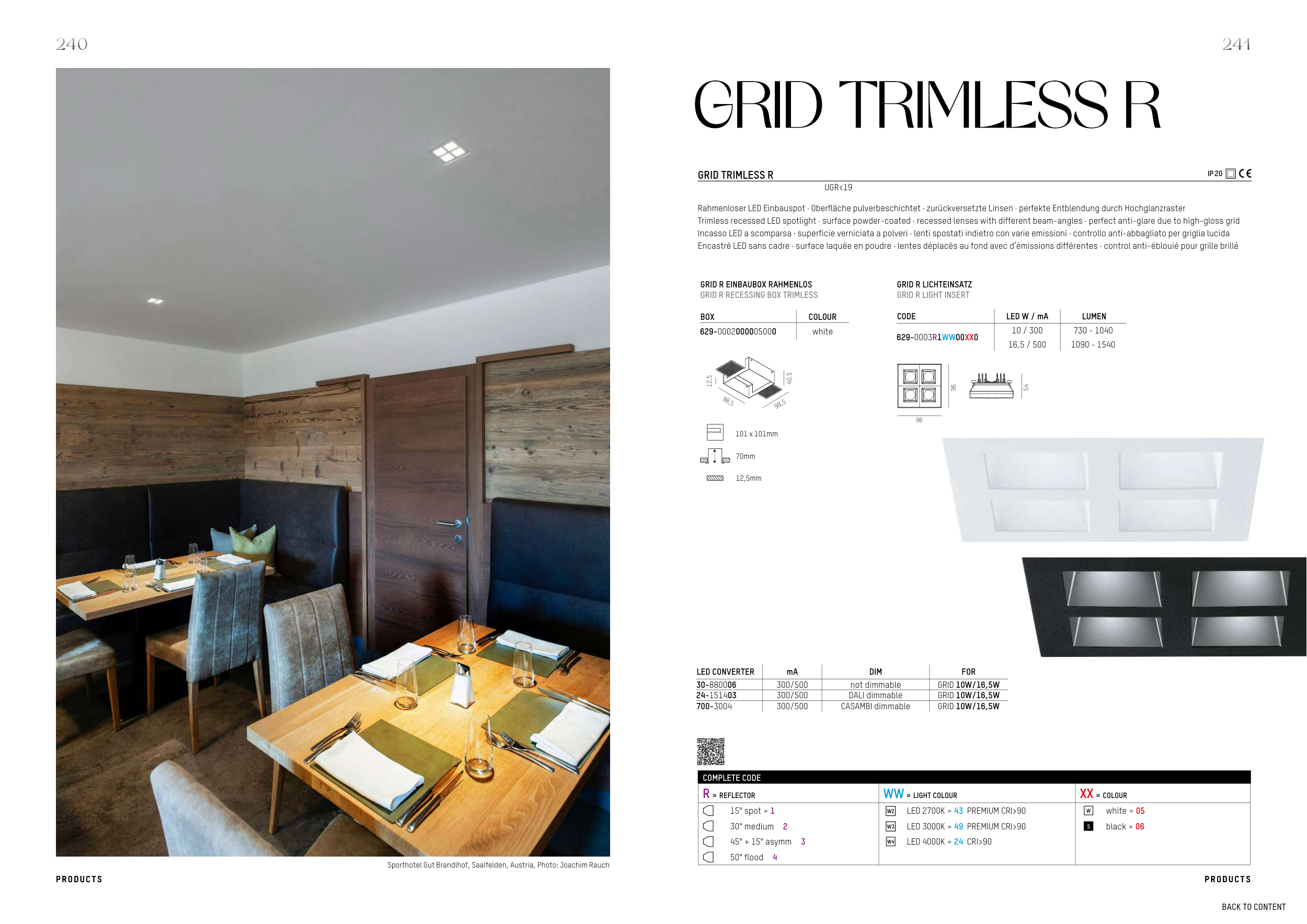 Trimless recessed LED spotlight · surface powder-coated · recessed lenses with different beam-angles · perfect anti-glare due to high-gloss grid