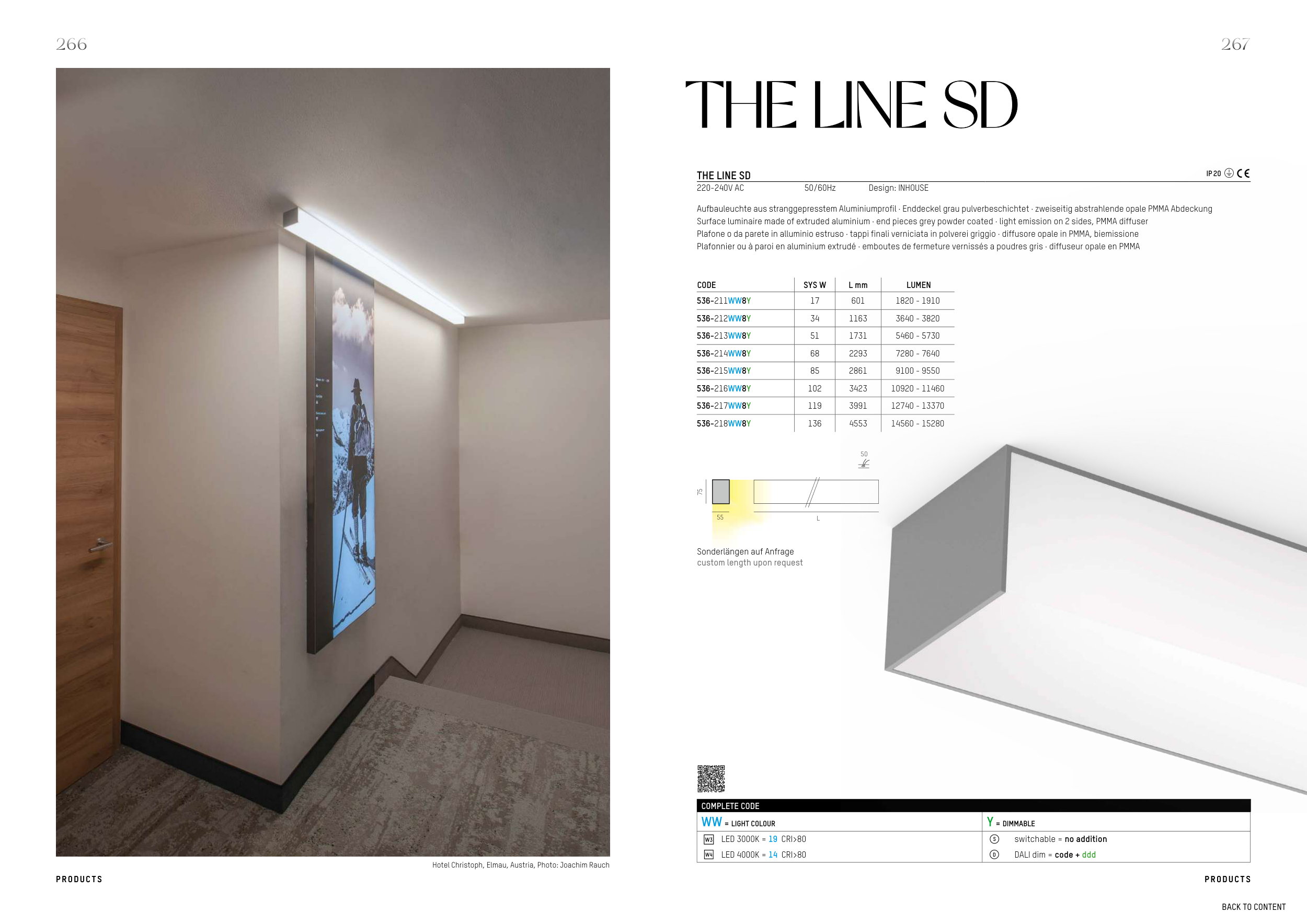 Surface luminaire made of extruded aluminium · end pieces grey powder coated · light emission on 2 sides, PMMA diffuser