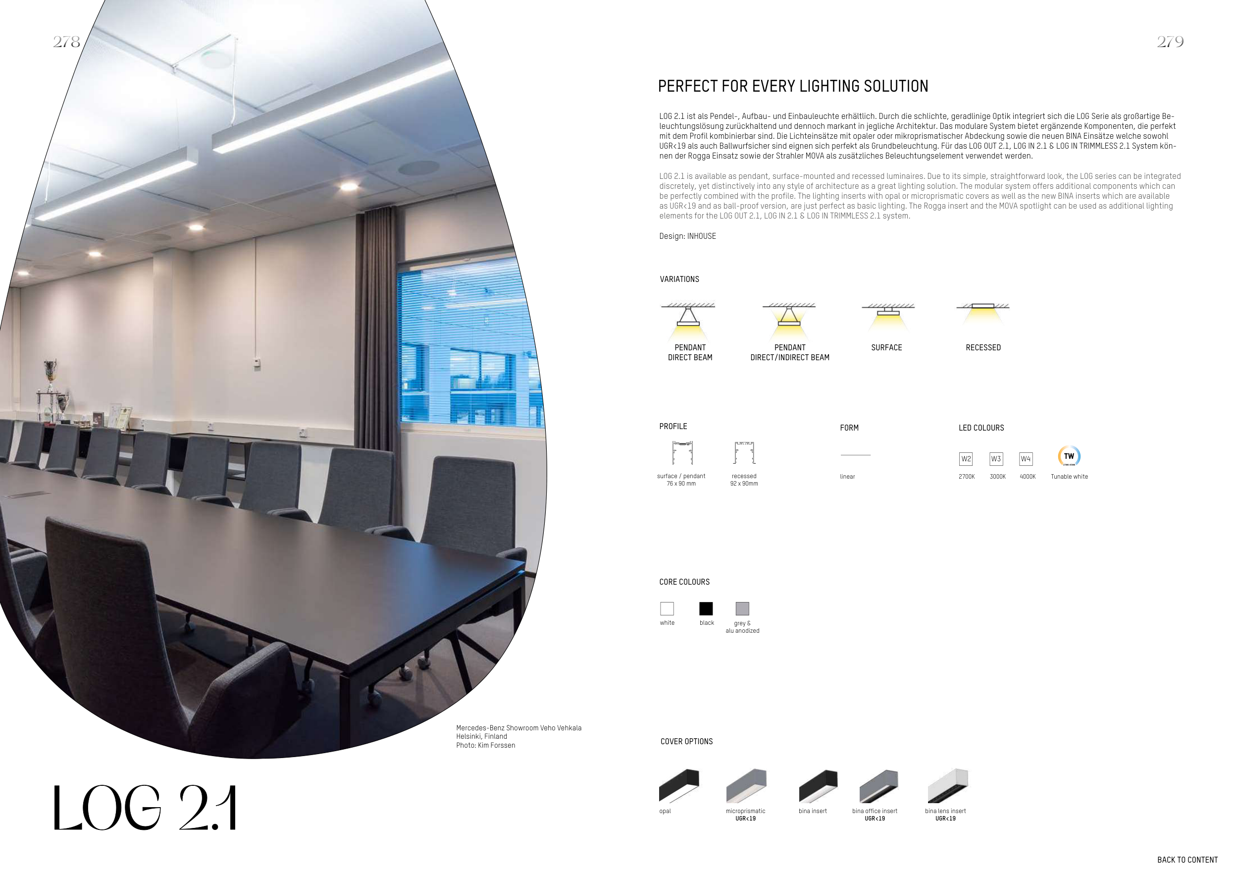 LOG 2.1 is available as pendant, surface-mounted and recessed luminaires. Due to its simple, straightforward look, the LOG series can be integrated