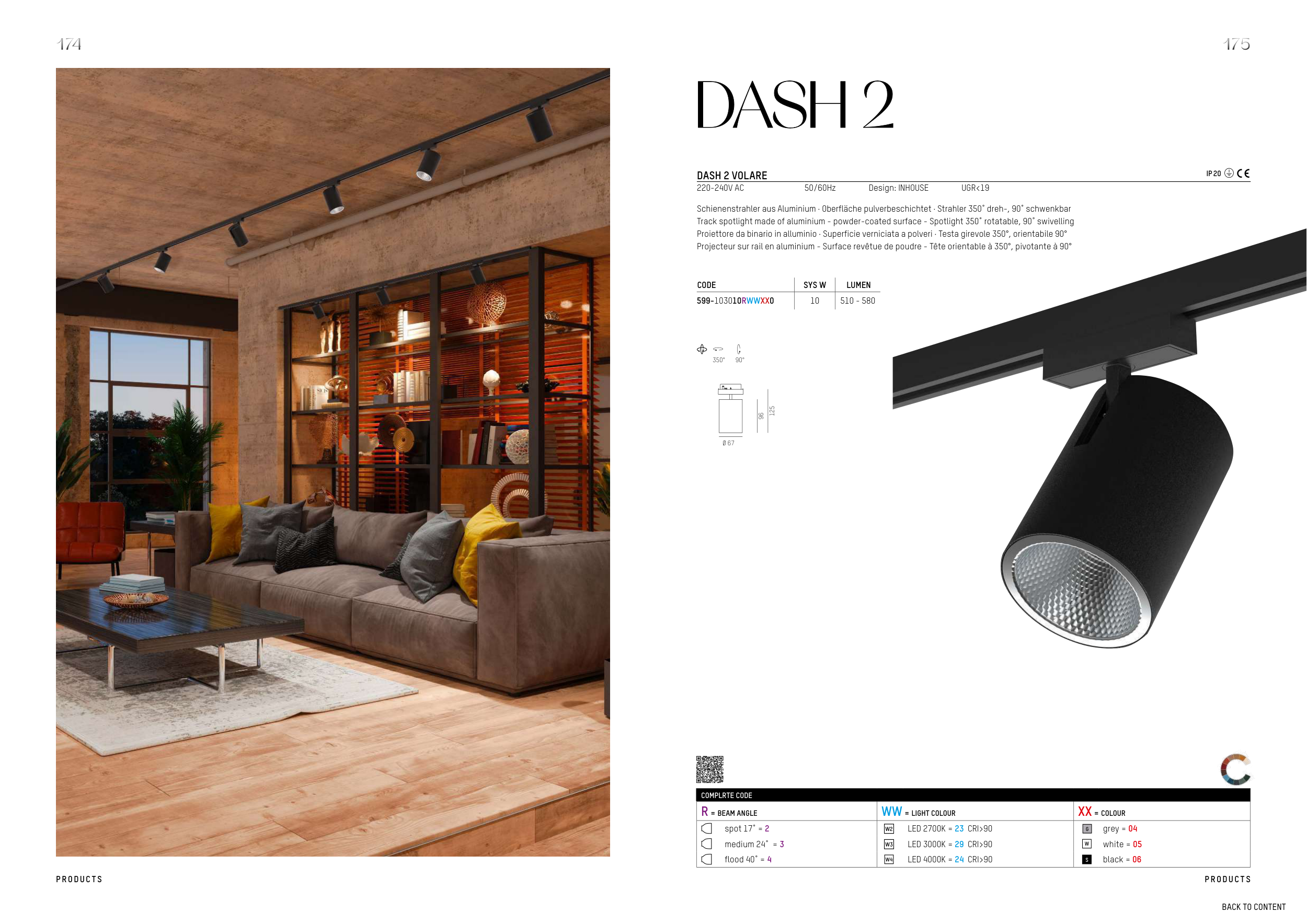 Proiettore da binario in alluminio · Superficie verniciata a polveri · Testa girevole 350°, orientabile 90°