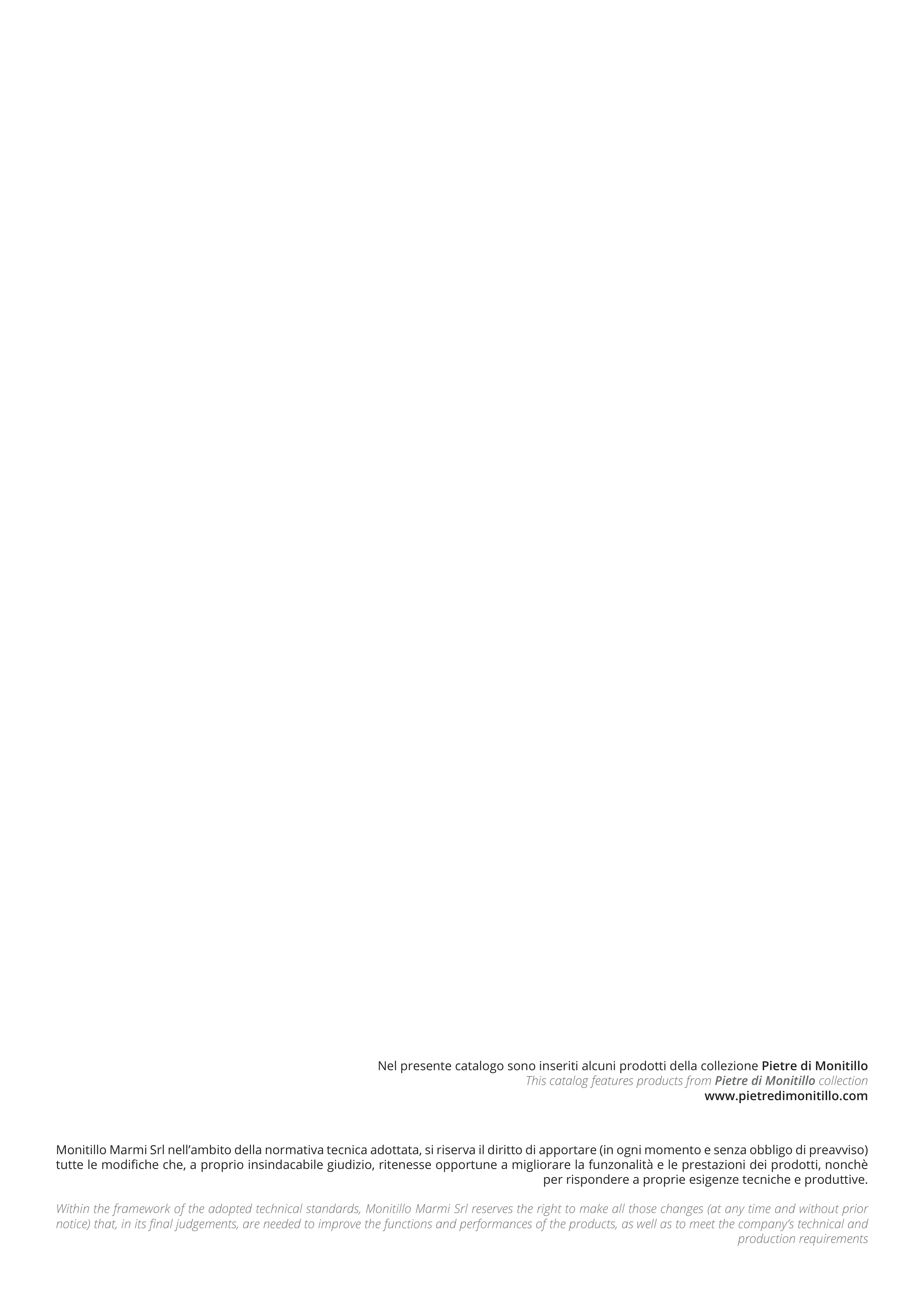 Monitillo Marmi Srl nell’ambito della normativa tecnica adottata, si riserva il diritto di apportare (in ogni momento e senza obbligo di preavviso)