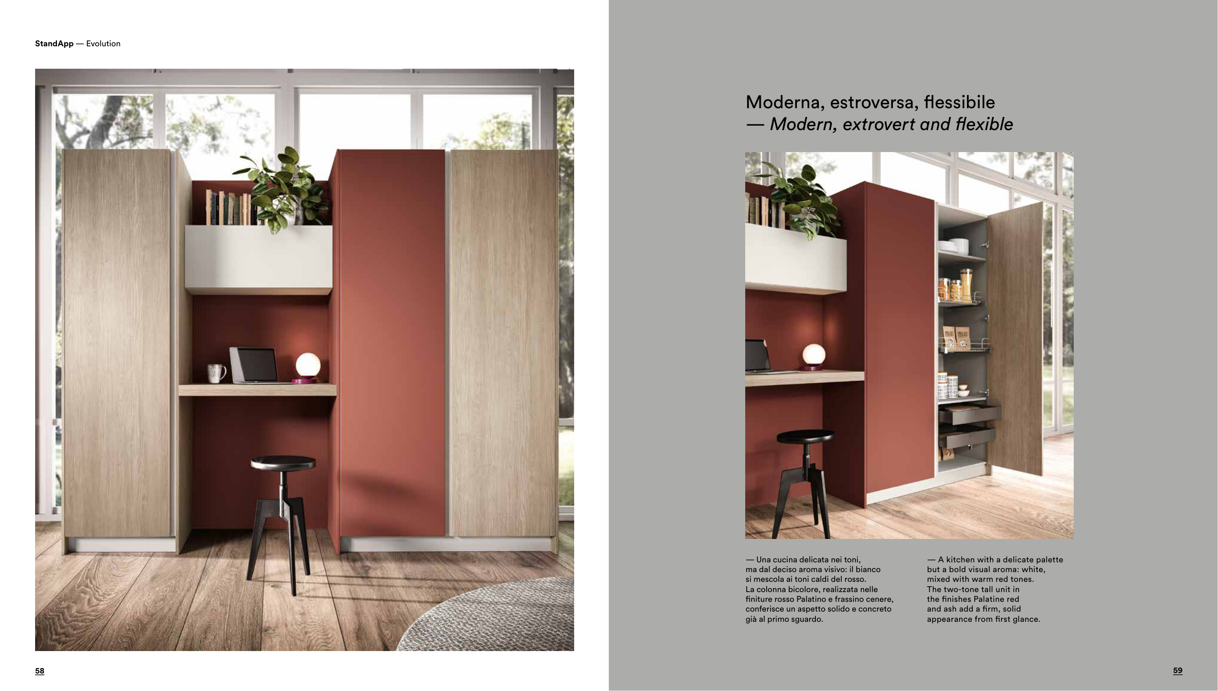 finiture rosso Palatino e frassino cenere,