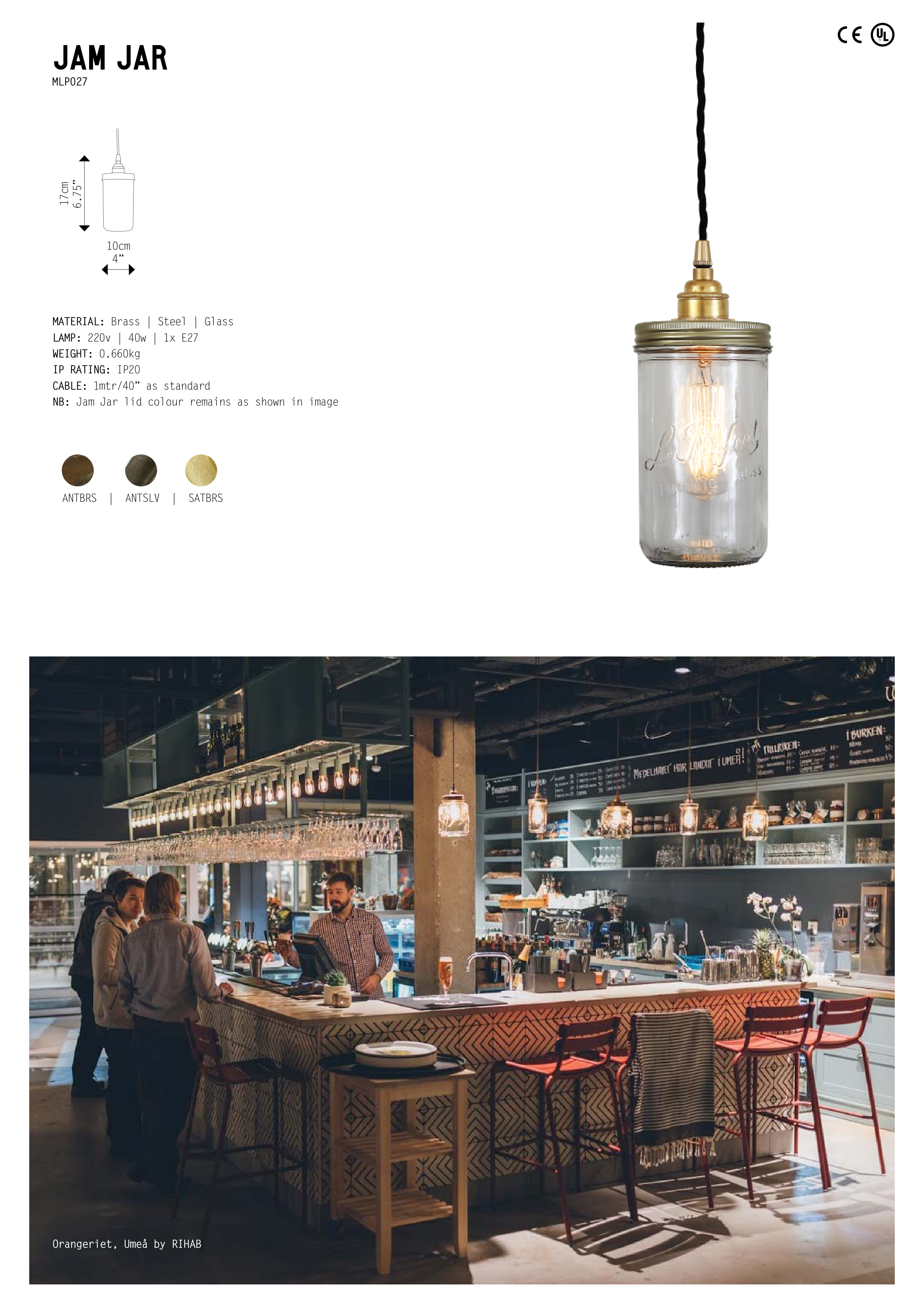 77 JAM JAR MLP027 MATERIAL: Brass | Steel | Glass LAMP: 220v | 40w | 1x E27 WEIGHT: 0.660kg IP RATING: IP20 CABLE: 1mtr/40” as standard NB: Jam Jar lid colour remains as shown in image ANTBRS | ANTSLV | SATBRS 10cm 4” 17cm 6.75” Orangeriet, Umeå by RIHAB