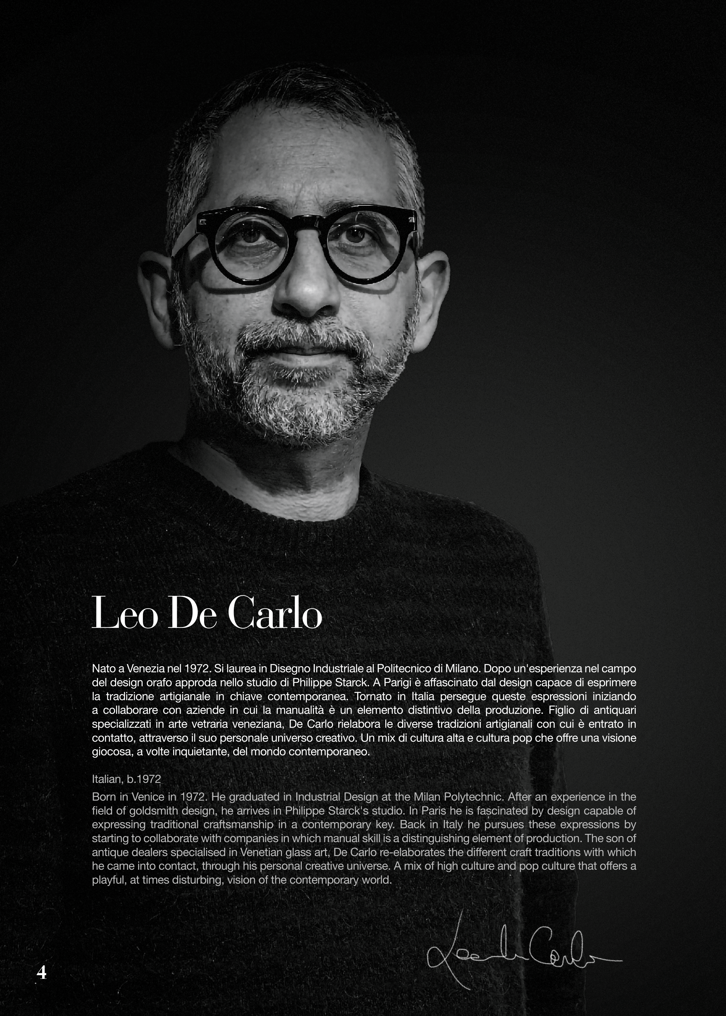 antique dealers specialised in Venetian glass art, De Carlo re-elaborates the different craft traditions with which