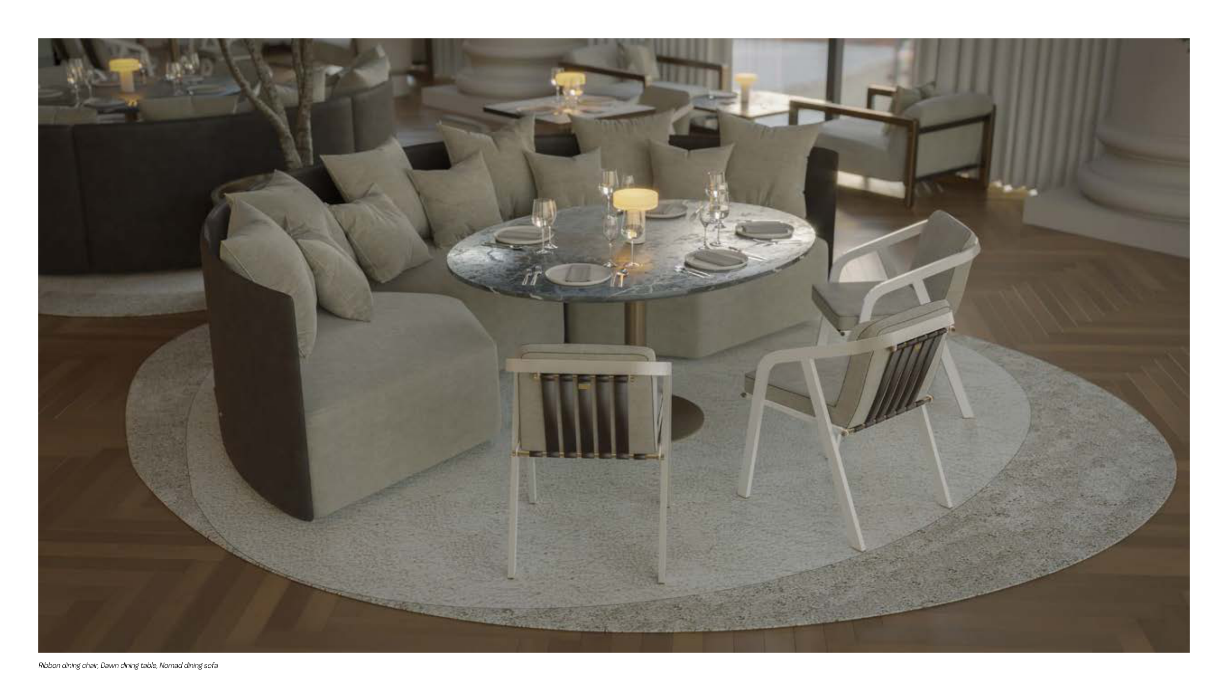 Ribbon dining chair, Dawn dining table, Nomad dining sofa