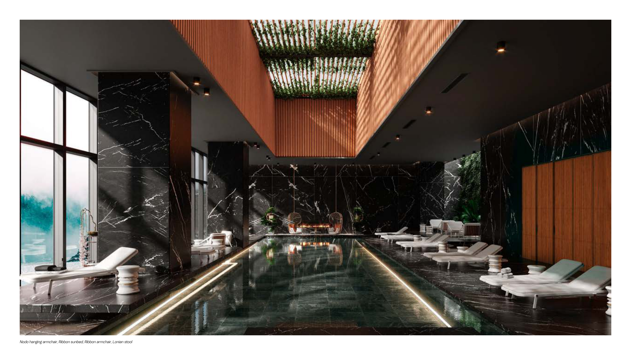 Nodo hanging armchair, Ribbon sunbed, Ribbon armchair, Lonian stool