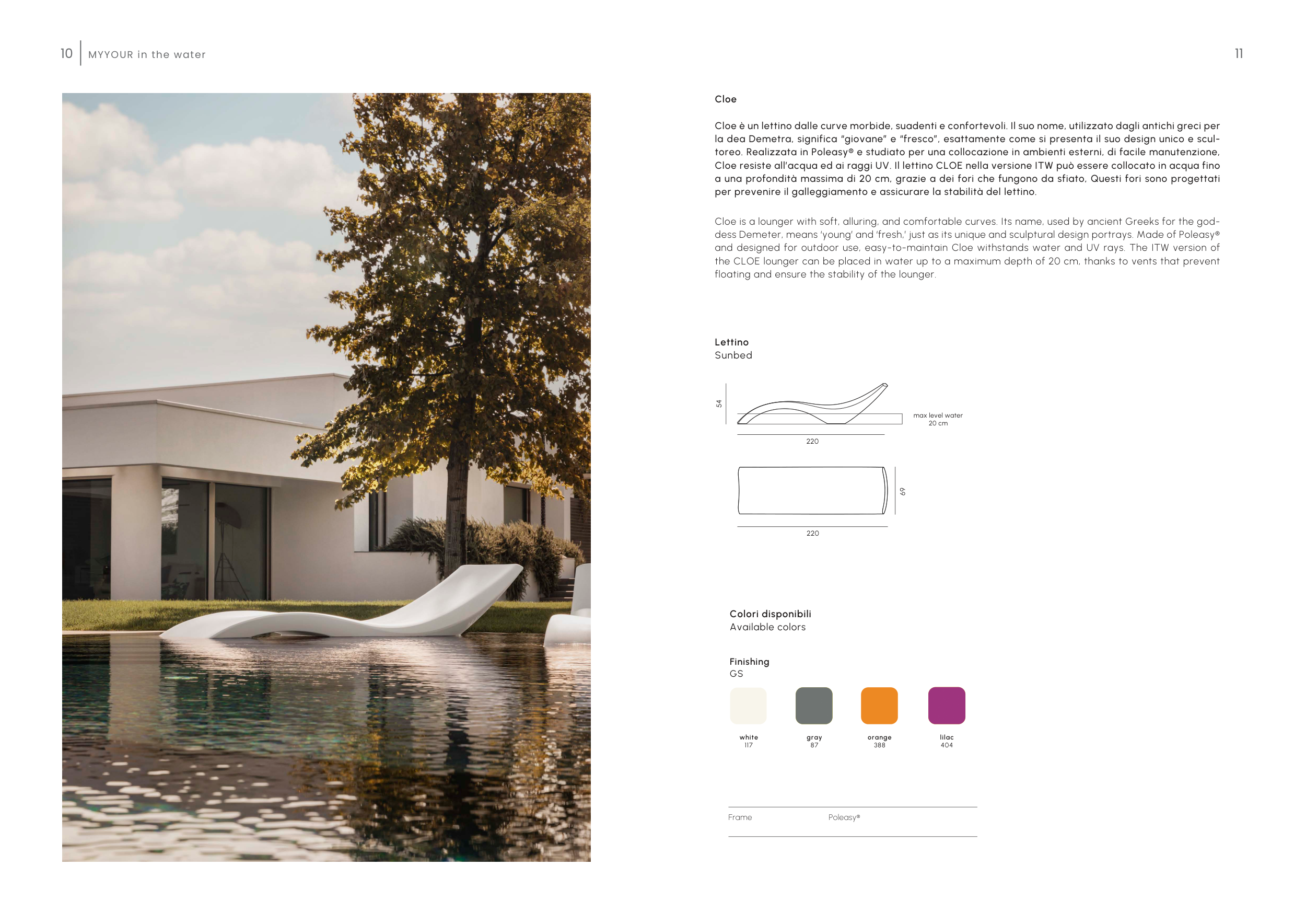 Cloe resiste all’acqua ed ai raggi UV. Il lettino CLOE nella versione ITW può essere collocato in acqua fino