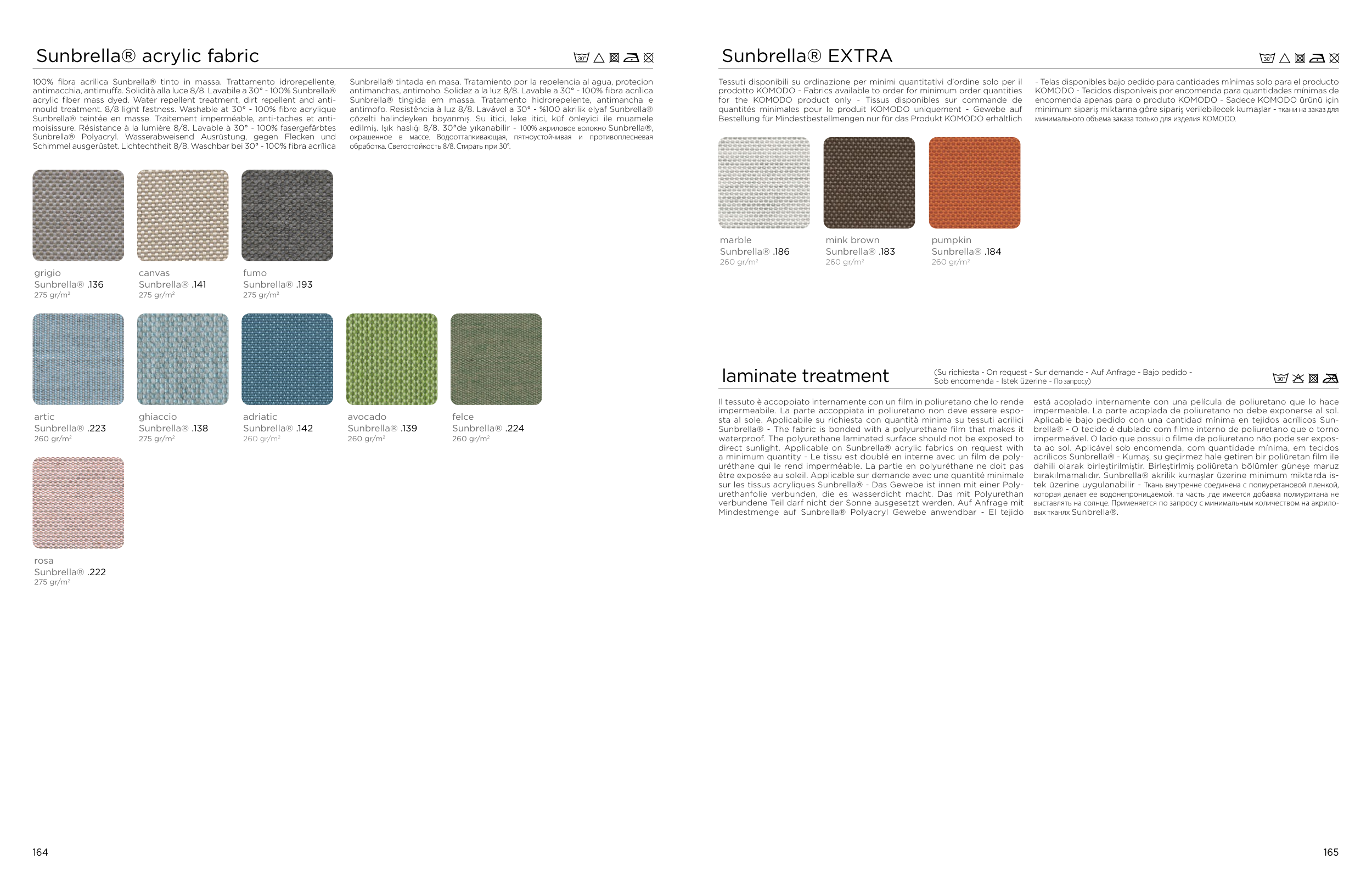 100% fibra acrilica Sunbrella® tinto in massa. Trattamento idrorepellente,