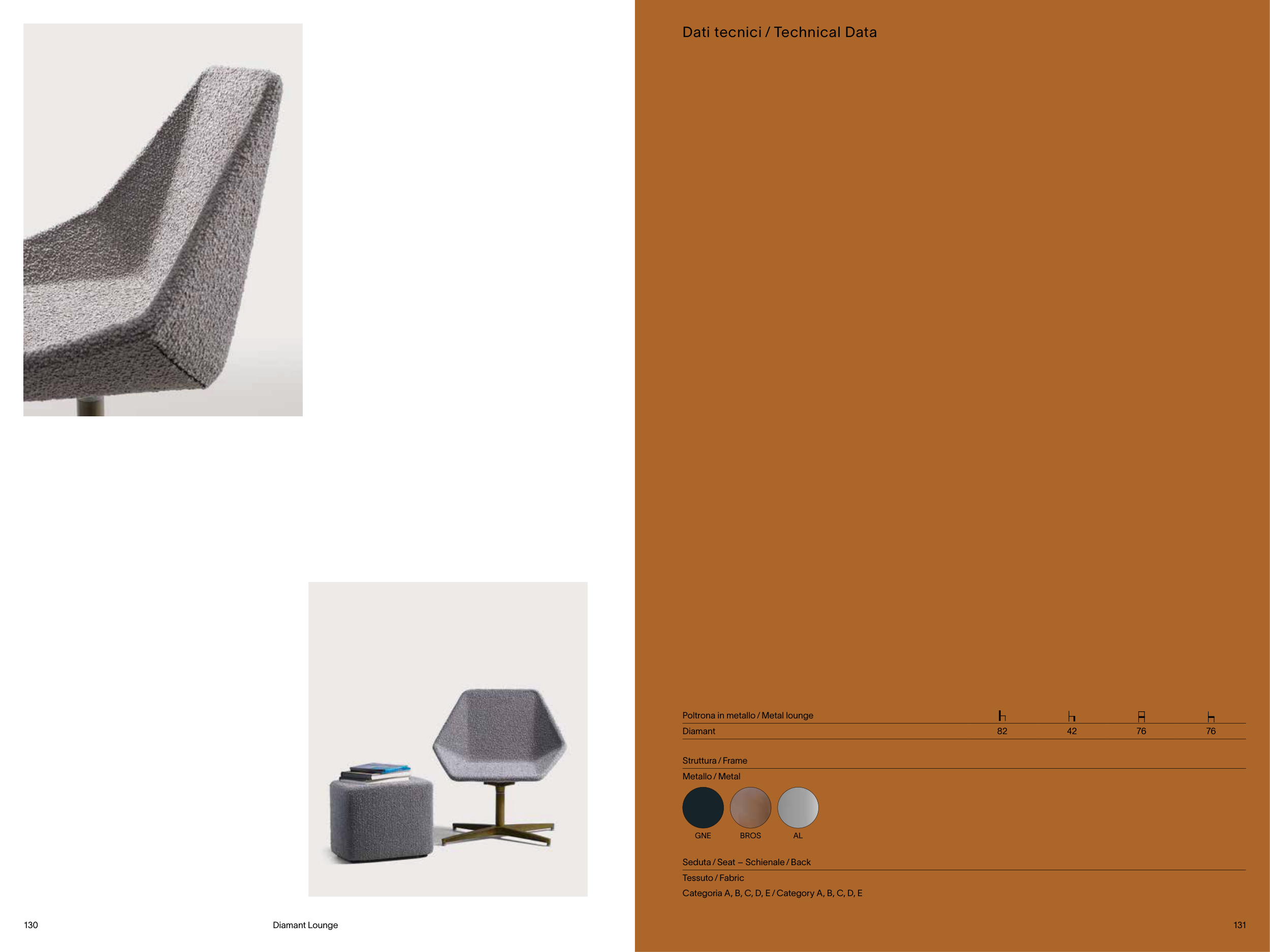 Dati tecnici ⁄ Technical Data Poltrona in metallo ⁄ Metal lounge Diamant 82 42 76 76 GNE BROS AL Struttura ⁄ Frame Metallo ⁄ Metal Seduta ⁄ Seat – Schienale ⁄ Back Tessuto ⁄ Fabric Categoria A, B, C, D, E ⁄ Category A, B, C, D, E Diamant Lounge 130 131