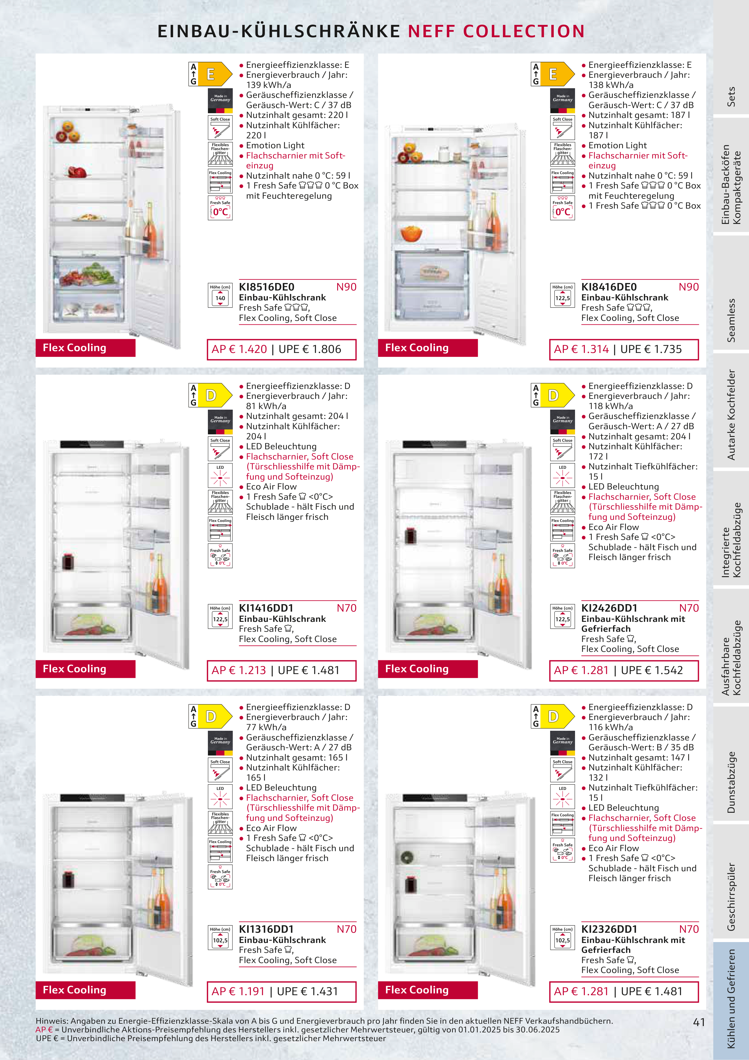 Hinweis: Angaben zu Energie-Effizienzklasse-Skala von A bis G und Energieverbrauch pro Jahr finden Sie in den aktuellen NEFF Verkaufshandbüchern.