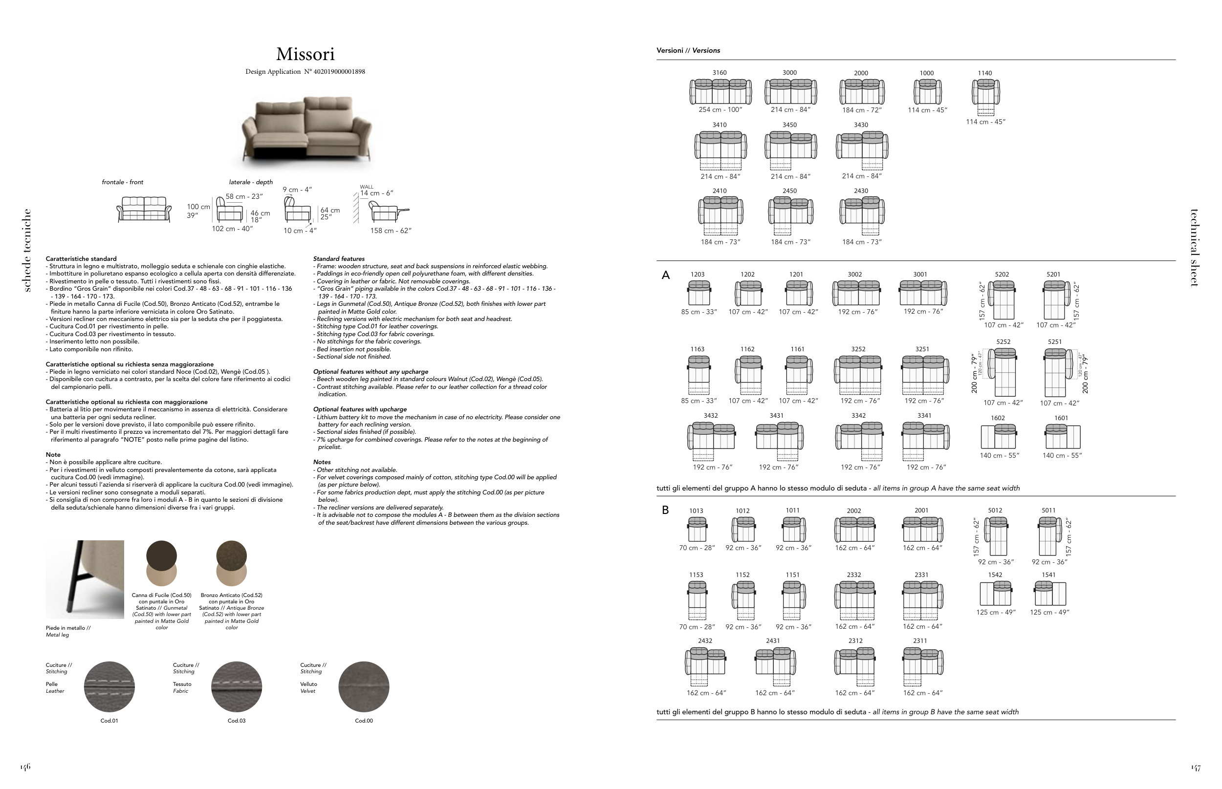 - For velvet coverings composed mainly of cotton, stitching type Cod.00 will be applied