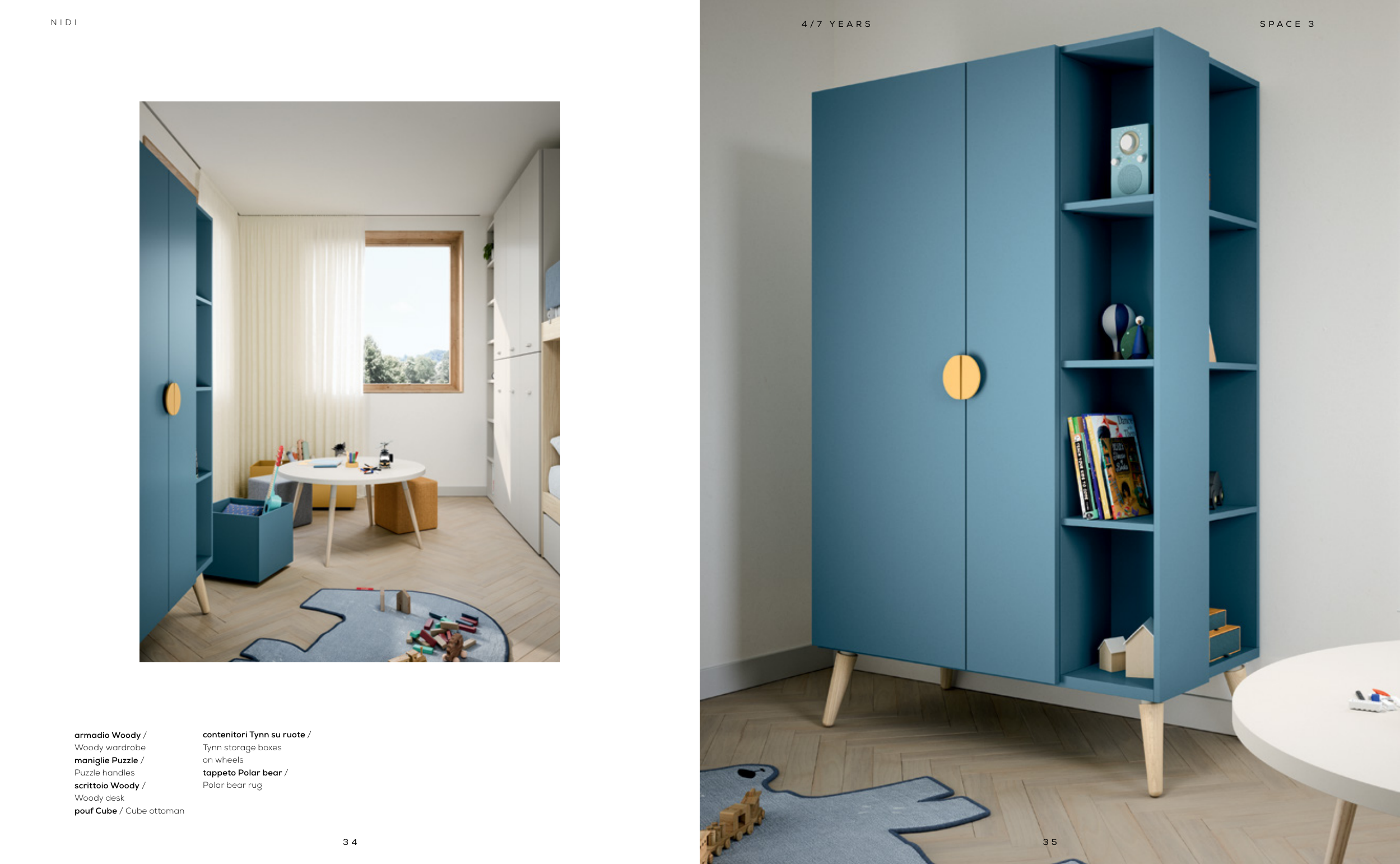 3 5 3 4 N I D I S P A C E 3 4 / 7 Y E A R S armadio Woody / Woody wardrobe maniglie Puzzle / Puzzle handles scrittoio Woody / Woody desk pouf Cube / Cube ottoman contenitori Tynn su ruote / Tynn storage boxes on wheels tappeto Polar bear / Polar bear rug
