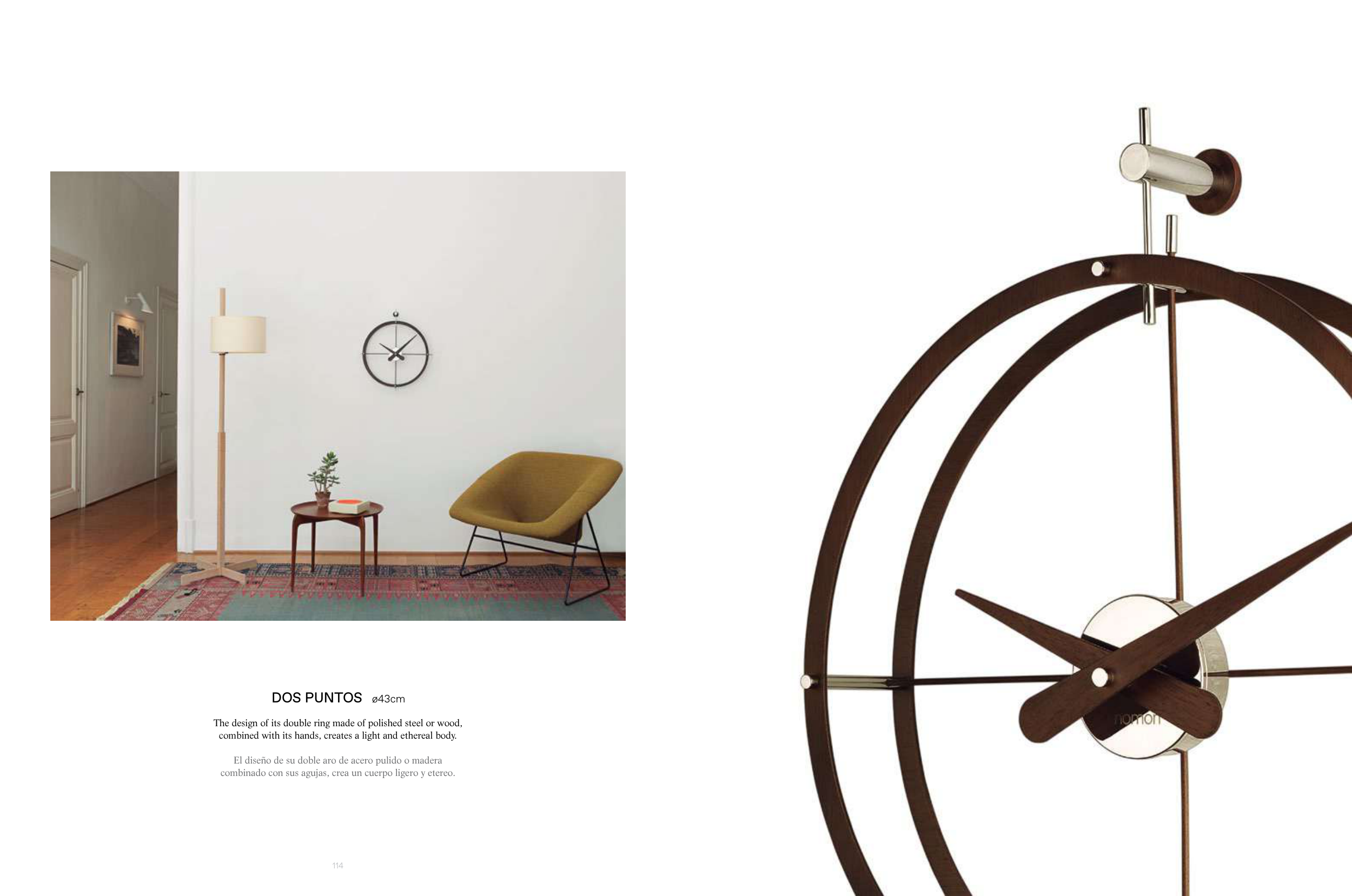 114 The design of its double ring made of polished steel or wood, combined with its hands, creates a light and ethereal body. El diseño de su doble aro de acero pulido o madera combinado con sus agujas, crea un cuerpo ligero y etereo. DOS PUNTOS ø43cm