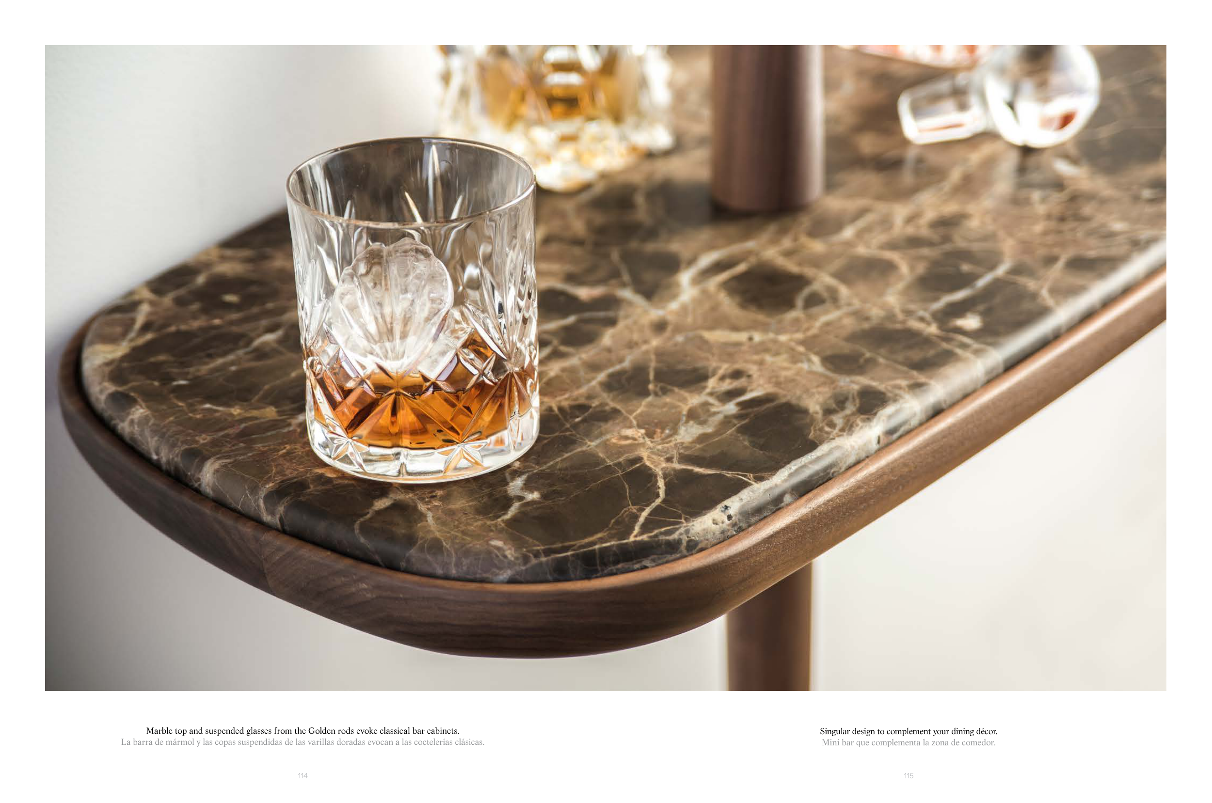Marble top and suspended glasses from the Golden rods evoke classical bar cabinets.